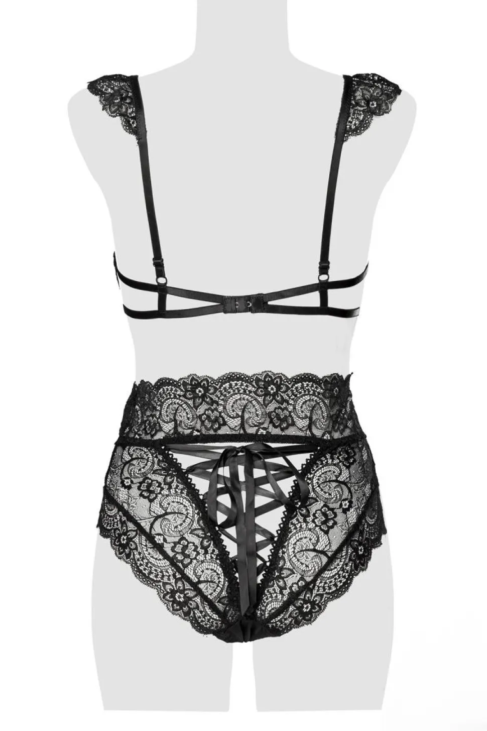 aufregendes Set, bestehend aus BH und hoch ausgeschnittenem Slip. BH ist an den Trägern verstellbar und hat einen Hakenverschluß, der ebenso verstellbar ist. Feinste dehnbare Spitze, ein TRAUM