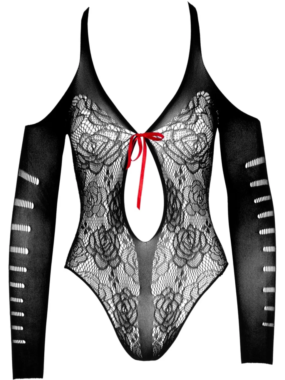 Streichelweicher Body ouvert von NO:XQSE in verführerischer Spitzenoptik. Mit ¾-Arm und Cut-outs auf den Schultern. Vorne tief ausgeschnitten – nur eine rote, schnell zu öffnende Bindeschleife hält die Fronten zusammen. Hinten vom Nacken bis zum Po weitere aufregende Cut-outs. Nahtlos gefertigt und hochelastisch für höchst angenehmen Tragekomfort.