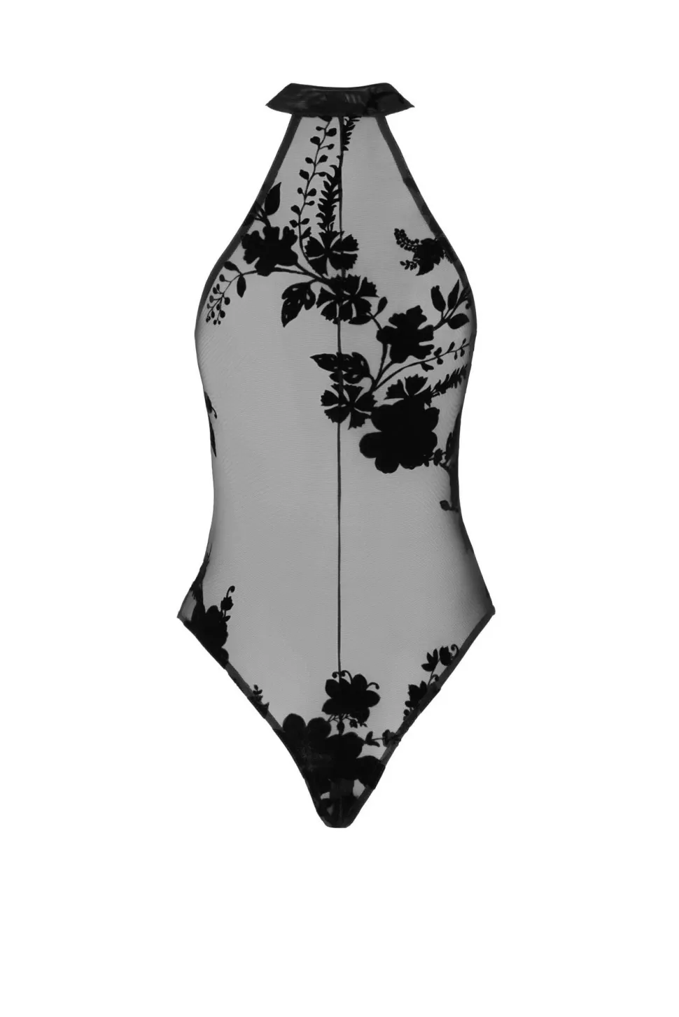 Edler Neckholder-Body aus Netzstoff mit Wildblumenbeflockung. Figurbetont mit offenen Schultern und einem versteckten 3-Wege-Reißverschluss.