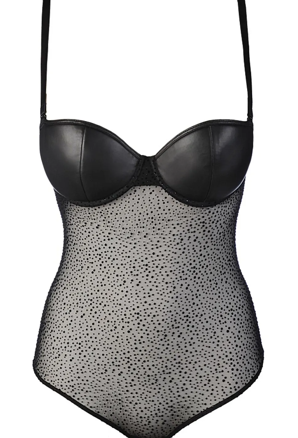 Ist dieser Body nicht sexy?! Der lederähnliche Look in Kombination mit semitransparenten Tüll lassen diesen Body besonders verführerisch aussehen. Besonderes Highlight sind die glänzenden Elemente auf dem Tüll. Dank der Verschlüsse im Schritt lässt sich der Body einfach an- und ausziehen.