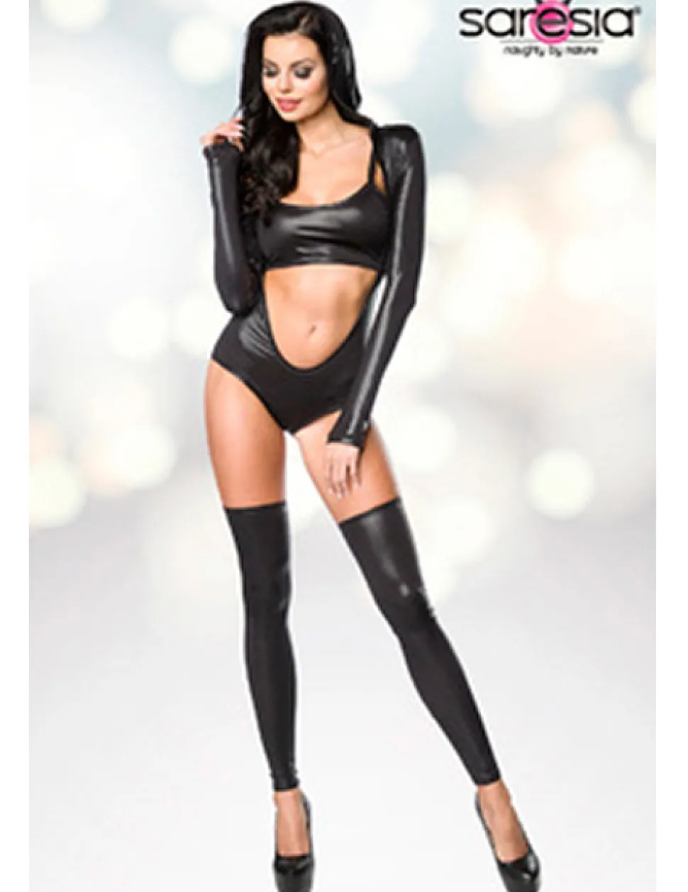 Trendstark für Club und Gogo-Dance: Body mit XXL-Ausschnitt in heißer Abstimmung mit bauchfreiem Spagetti-Top und zwei Beinstulpen. Der Body ist zusätzlich mit einer großzügigen Kapuze ausgestattet. Seine langen Ärmel enden mit einem Daumenloch für glatten, ästhetischen Sitz. Das weiche Material in Wetlook-Optik besitzt einen aufregenden metallischen Schimmer und irisiert das einfallende Licht. Bedingt durch den hohen Einsatz von Elasthan macht das Body-Set alle Bewegungen mit.