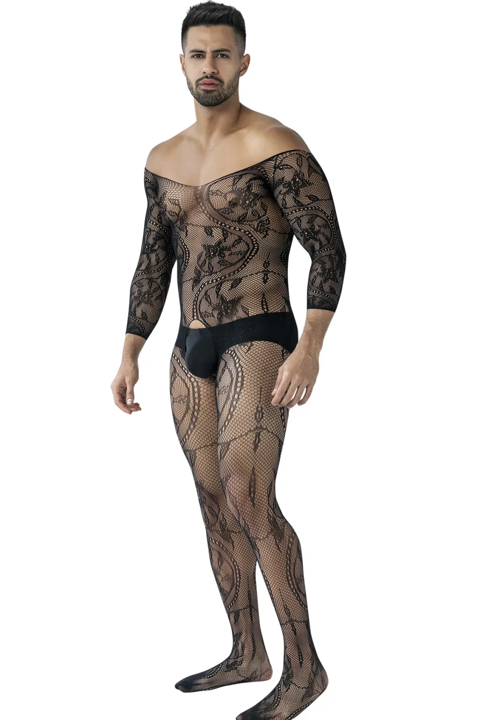 Bodystocking aus dehnabrem Netzmaterial, im Schritt offen. Kommt ohne Slip!