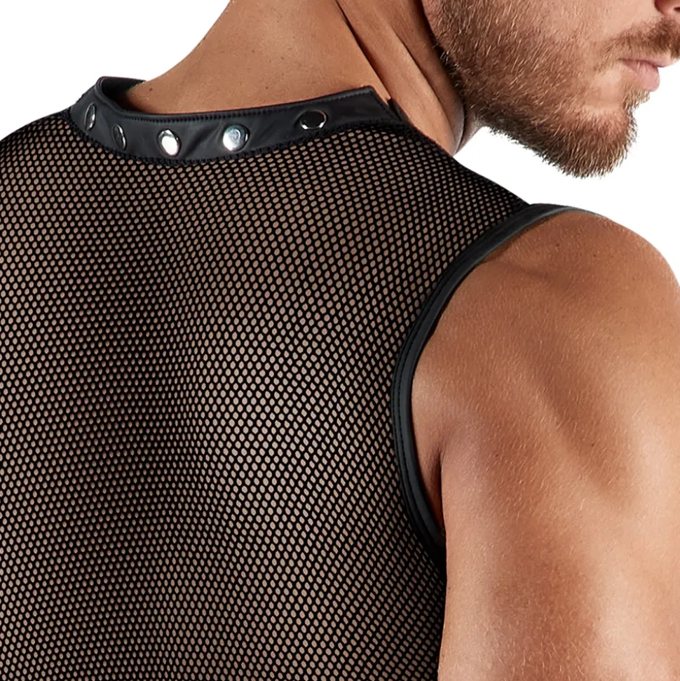 Ärmelloses Netz-Shirt mit Schenkel-Harness, Netz-Jock und 2 Handfesseln im schwarzen Set von Svenjoyment BONDAGE. Das elastische weiche Netzmaterial ist mit Riemen-Applikationen und Details im Mattlook versehen. Dazu viele (Fessel-) Ringe und dekorative Nieten. Schenkel-Harness vorne fest am Shirt angenäht, mit Druckknöpfen passend verstellbar. Seitlich mit Ringen, in denen die beiden beiliegenden Handfesseln mit ihren Karabinerketten eingehakt werden können. Die soften Fesselmanschetten sind mit Druckknöpfen schnell angelegt und angepasst. Po-freier Jock mit Komfort-Bund, sowie nietenbesetztem Mattlook-Riemen auf der Vorderseite
