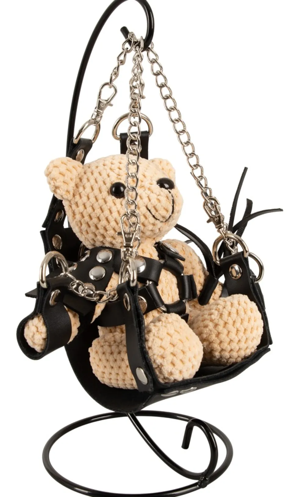 Handzahmer kleiner SM-Teddy with Swing von Bad Kitty. Teddy in gehäkelter Optik und superweich im Griff. Ausstaffiert im typischen SM-Look mit Harness, Fesseln und Mini-Peitsche aus schwarzem Lederimitat. Am Kopf ein Schlüsselanhänger mit Kettchen und Ring. Die kleine stilechte Slingmatte wird einfach in das Metallgestell den Mini-Sling eingehängt – und schon kann Teddy Platz nehmen… 😛