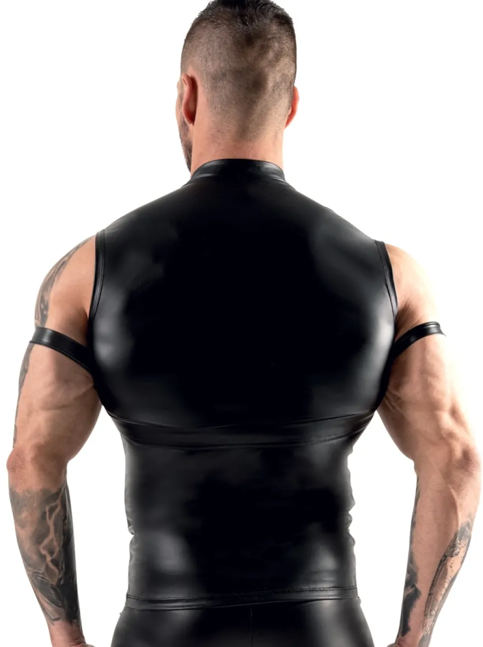 Top von Svenjoyment Bondage im schwarzen trendigen Mattlook mit Nieten besetztem Harness (nicht abnehmbar). Harness seitlich mit Ringen, in die beiliegende Fesselriemen für die Arme befestigt werden können. Die Fesselriemen im Mattlook haben verstellbare Klettverschlüsse.