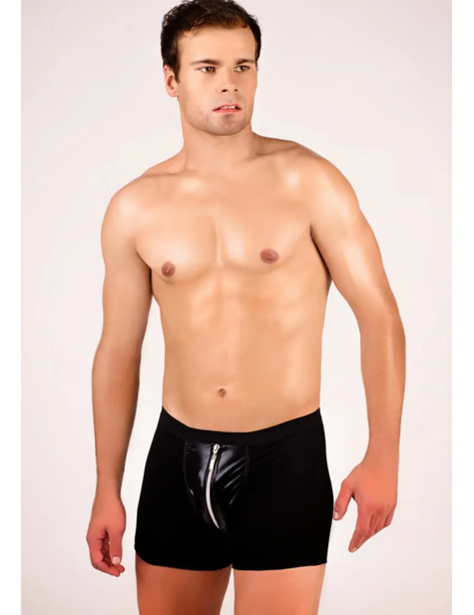 – Schwarzer Wetlook-Front, welche sich durch einen Reißverschluss öffnen lässt