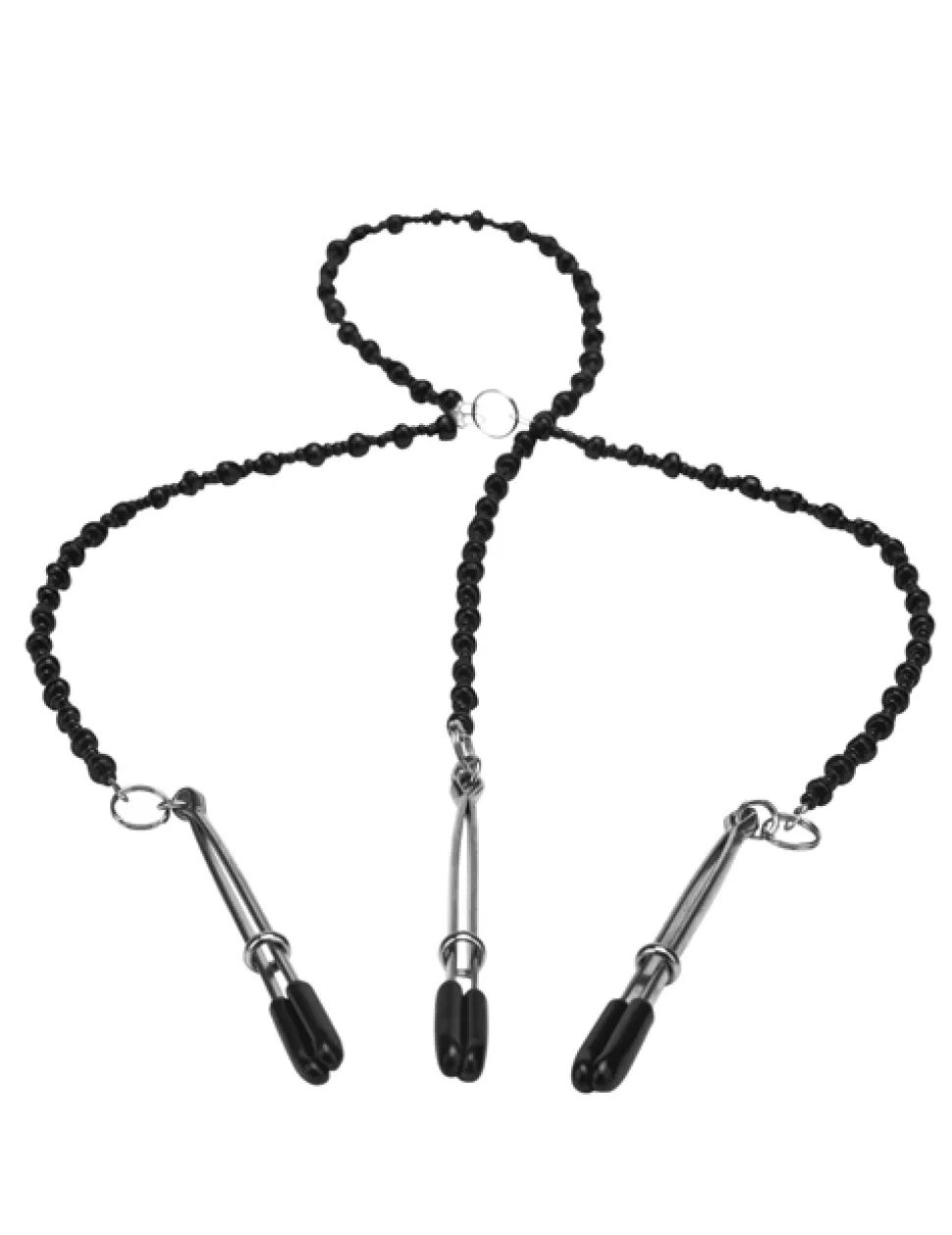 Diese Intim- und Brustwarzen-Klemmen im Y-Stil sind wie geschaffen für die handfreie Stimulation und schmerzreizende Empfindungen an Klitoris oder Brustwarzen. Die ummantelten Spitzen ermöglichen hohen Tragekomfort, auch bei Länge:rer Verwendung. Die Klemmen können durch verschiebbare Ringe individuell eingestellt werden, somit kann der dominierende Partner den Schmerzreiz individuell bestellen.