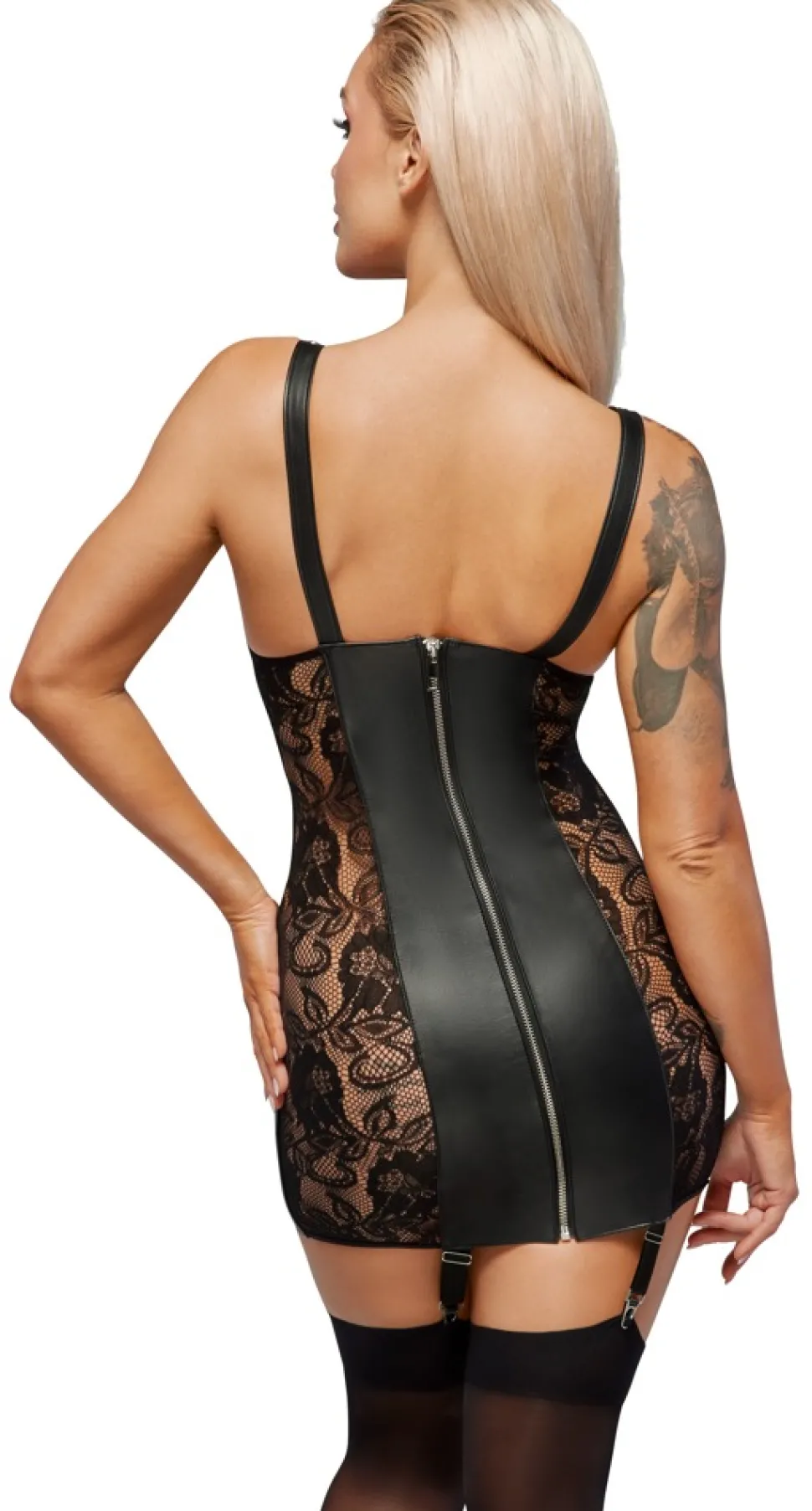 Schmales, kurzes, busenfreies Straps-Kleid von ZADO aus weichem Lammleder mit silberfarbenen Metalldetails. Der freiliegende Busen wird von Lederriemen aufregend umrahmt. Spektakuläre Rückansicht mit zwei breiten, elastischen Spitzen-Einsätzen und durchgehendem Reißverschluss in der Mitte. Die Träger sind mit Schnallenverschlüssen passend verstellbar. Die 4 verstellbaren Strumpfhalter sind vom Minikleid abnehmbar.