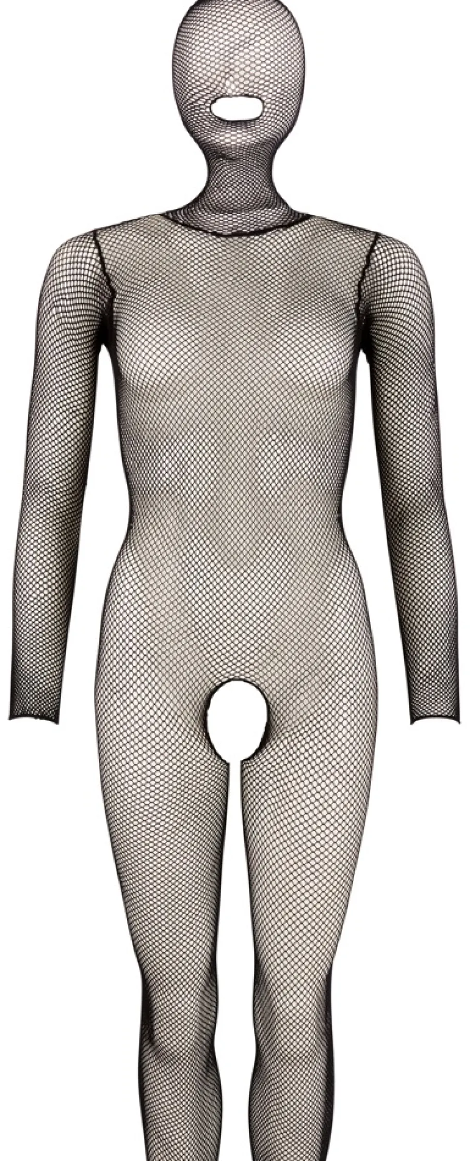 Hochelastischer Catsuit ouvert mit Kopfmaske ohne Augen- und Nasenlöcher. Lediglich der Mund bleibt frei. Aus feinem Netzmaterial, mit Fuß und rundem Ausschnitt im Rücken.