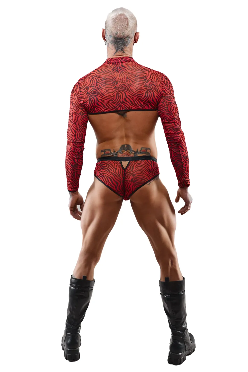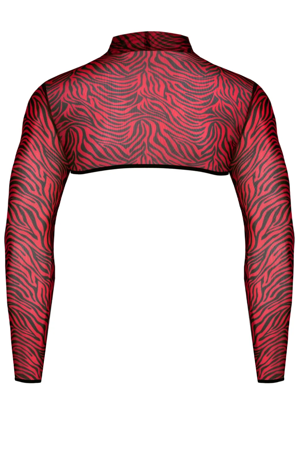 Crop-Top komplett aus sehr dehnbarem und elastischem Tüll in Schwarz und Rot im Zebramuster. Verbreitert effektiv die Schultern und die Brust und bringt den nackten Rücken und Oberkörper zum Vorschein. Am Umfang im unteren Teil und an den Ärmeln mit Gummiband abgeschlossen. Durch diese Lösung und die elastischen Eigenschaften des Materials passt es sich perfekt an den Körper an und unterstreicht deine Vorteile.