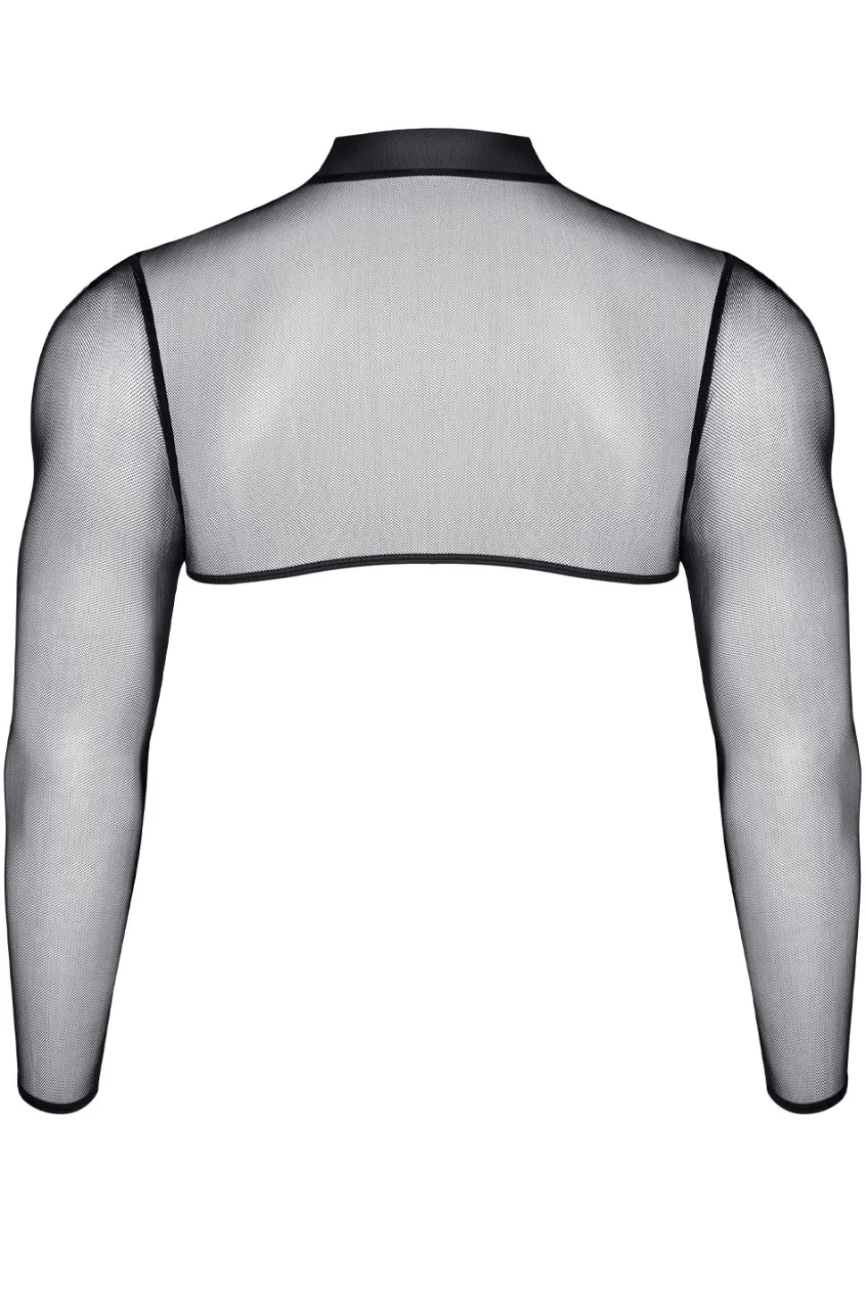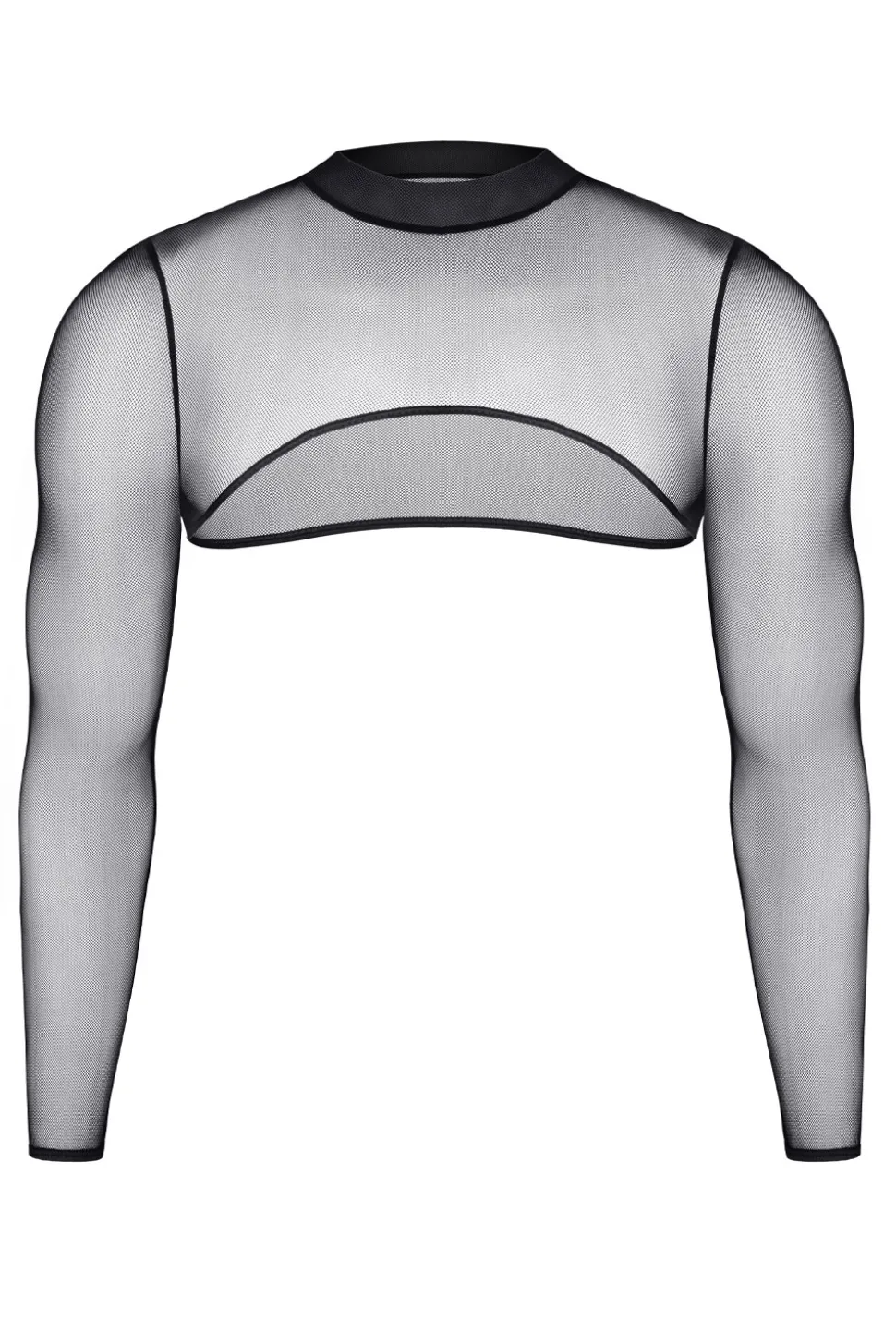 Crop-Top komplett aus dehnbarem und elastischem Tüll in Schwarz im Wetlook-Stil. Verbreitert effektiv die Schultern und die Brust und bringt den nackten Rücken und Oberkörper zum Vorschein. Am Umfang im unteren Teil und an den Ärmeln mit Gummiband abgeschlossen. Durch die elastischen Eigenschaften des Materials passt es sich perfekt an den Körper an.