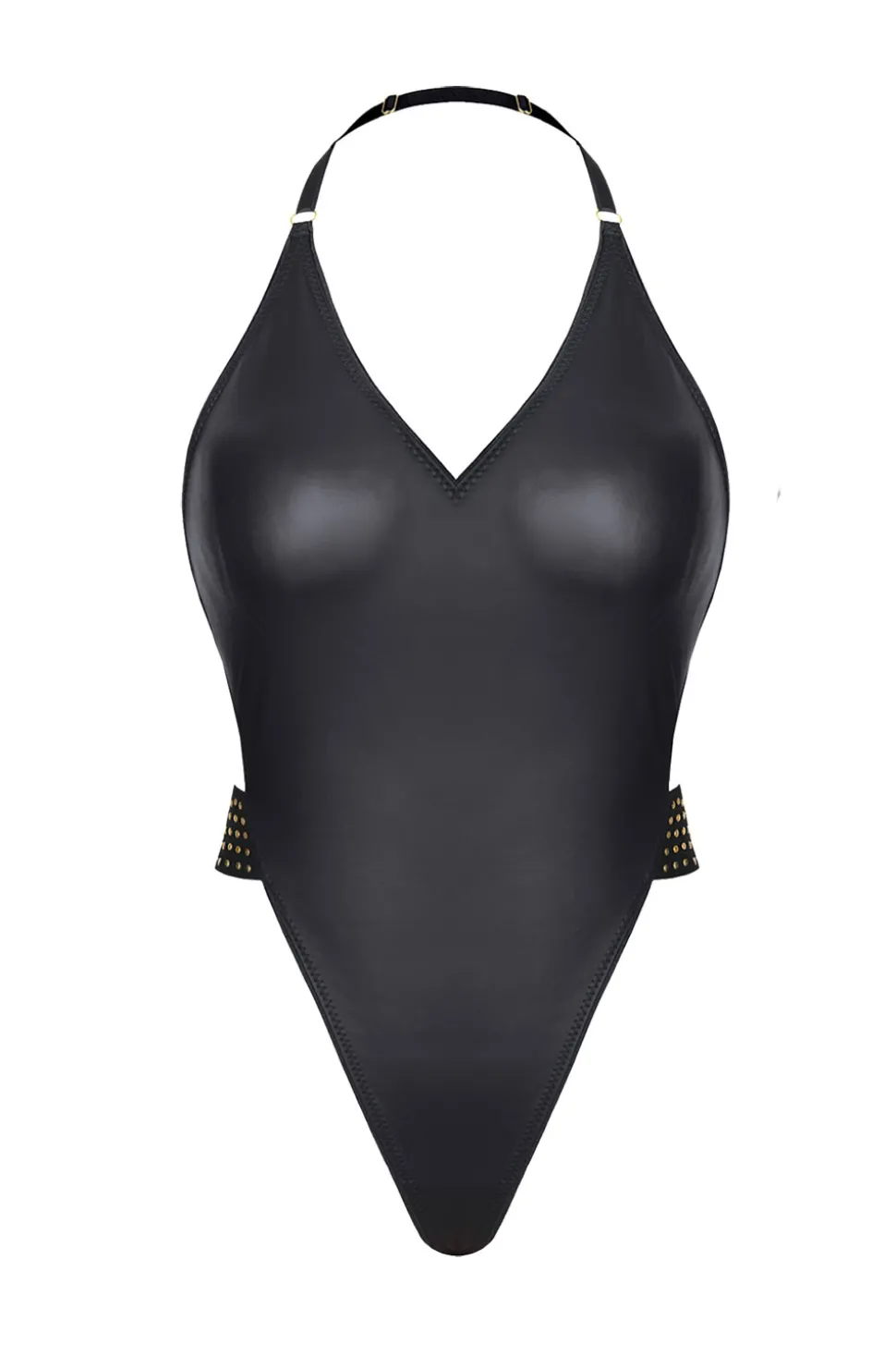 Ein Body, der die Silhouette perfekt formt. Ganz aus schwarzem, dehnbarem Wetlook-Stoff, wodurch er sich perfekt an den Körper anschmiegt und seine Kurven betont. Hoch profilierte Seiten verlängern die Beine optisch und verschlanken die Silhouette. Auf der Vorderseite gibt es ein auffälliges Dekolleté und auf der Rückseite, hebt der Body mit schwarzem Stoff, sinnlich Po und der nackte Rücken hervor. Ergänzt wird der ganze auffällige Look durch dekorative Elemente: Goldapplikationen am Gummizug in der Taille und am Rücken und strapazierfähige goldfarbene Metallringe. MUST HAVE!
