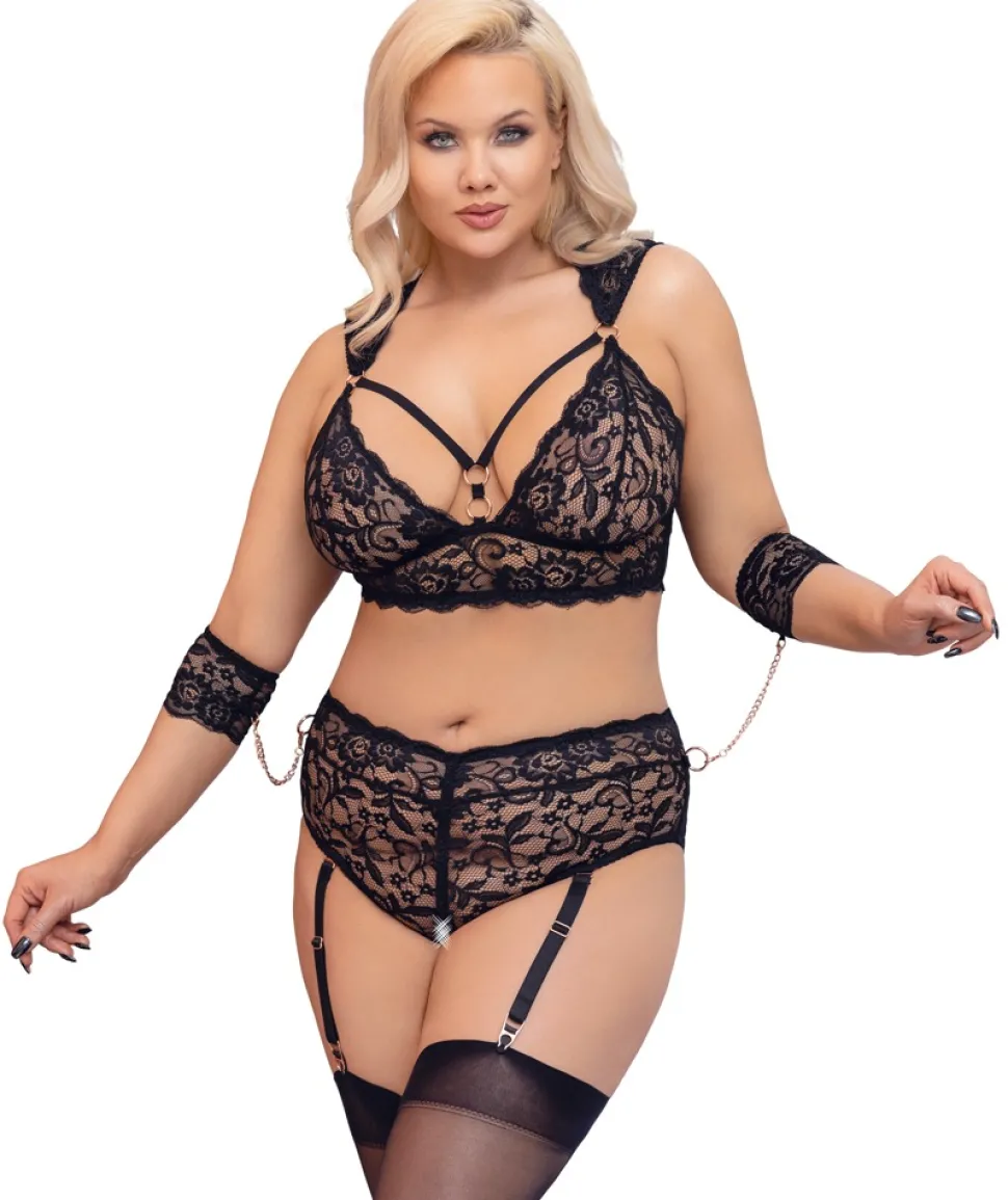Zarte Spitze für fesselnde Lustmomente! Bustier, Straps-Slip ouvert und Armfesseln im Set aus weicher elastischer Spitze mit roségoldfarbenen Details. Die elastischen Armfesseln sind mit ihren Karabiner-Ketten von den seitlichen Ringen des Slips abnehmbar. Das Bustier verführt mit Stretchbändern und Ringen im Dekolleté und einer raffinierten freien Rückansicht. Es hat hinten einen Hakenverschluss sowie einen kleinen Clipverschluss oben im Nacken. Der Straps-Slip ist im Schritt einladend offen, die verstellbaren Strumpfhalter sind vom Slip abnehmbar.