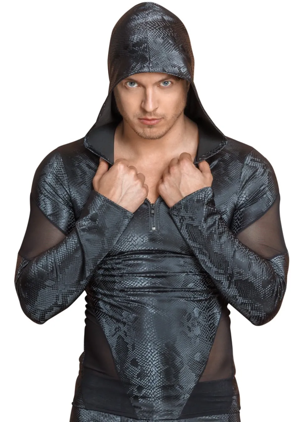 Trendiges Langarm-Shirt von NEK in mattglänzend schillernder Schlangenhaut-Optik mit schwarzen Powernt-Einsätzen. Stylisch mit Kapuze und kleinem Reißverschluss vorne. Fantastisch elastisch für hautnahen Sitz und hohen Tragekomfort.