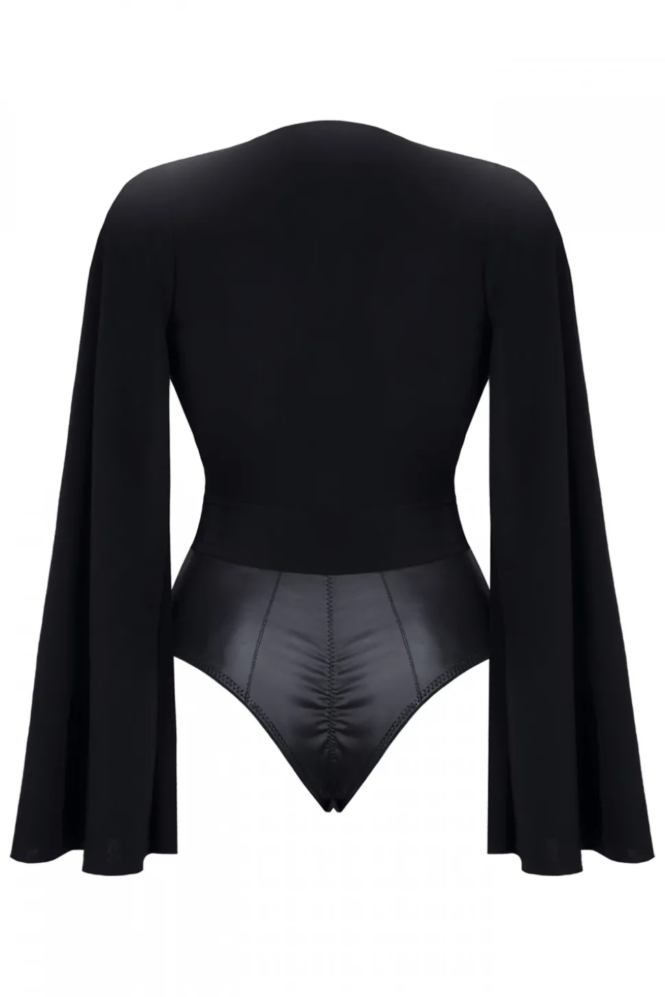 Eleganz, Stil und Energie, strahlt dieser einzigartiger Body mit langen Ärmeln, offenen Schultern und einem faszinierenden tiefen Ausschnitt aus. Er wurde aus 2 verschiedenen Stoffen hergestellt. Das Oberteil ist aus weichem, elegantem und angenehm anzufassendem schwarzem Strickstoff, dieser schmiegt sich wunderbar an den Körper an und fühlt sich angenehm an. Die Unterseite ist aus schwarzem, elastischem Wetlook. Auf der Rückseite wurden vertikale Nähte verwendet, die den Stoff leicht knittern. Ein Must-Have für weibliche Liebhaber stilvoller, aber auch sinnlicher Dessous.