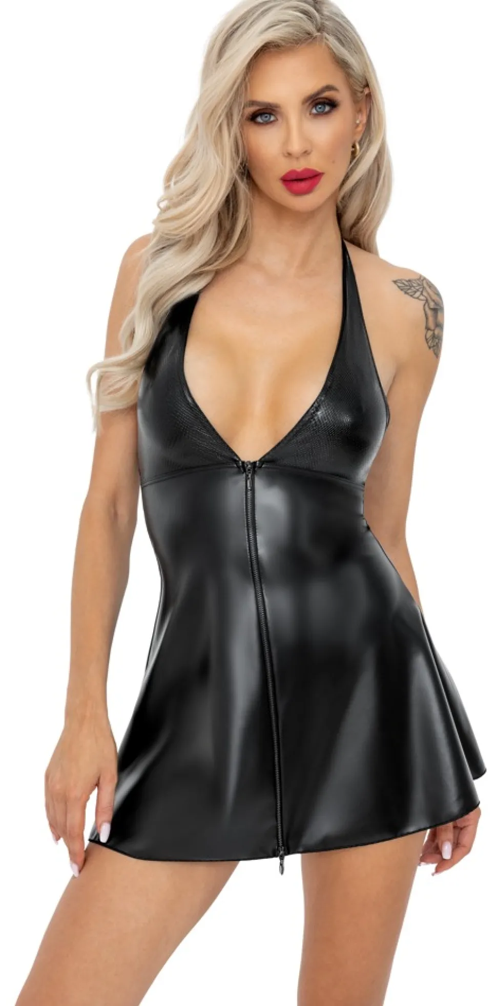 Kurzes Kleid von Noir in mattglänzend schillernder Schlangenhaut-Optik (Oberteil) im Mix mit Powerwetlook (Rockteil). Rundum weich und elastisch für maximalen Tragekomfort. Oberteil eng und extra tief dekolletiert, Rockteil schwingend ausgestellt. Mit Neckholder – rückenfrei. Praktisch und erotisch zugleich ist der durchgehende Reißverschluss im Vorderteil.