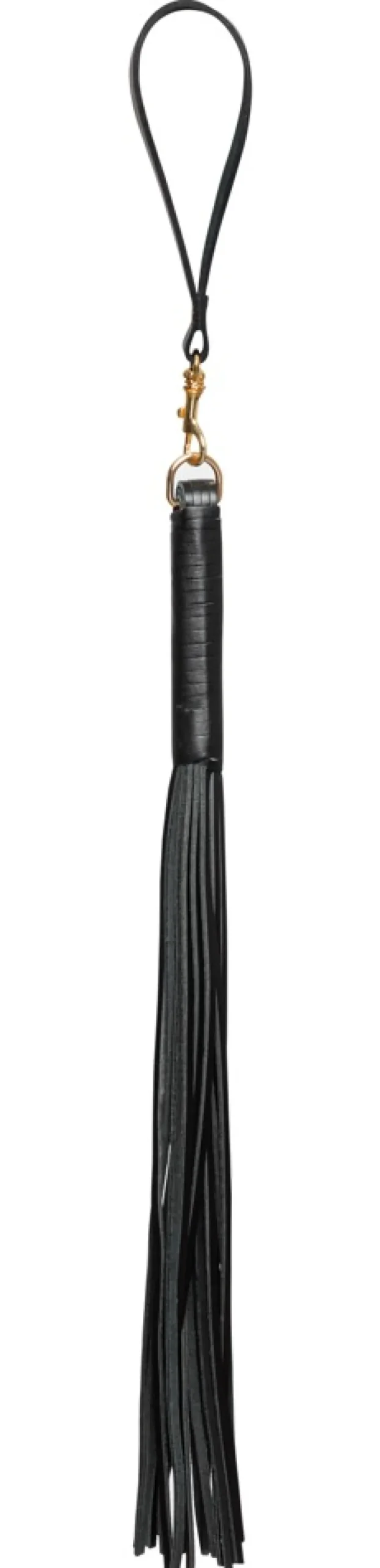 Handlicher Leder-Flogger von ZADO mit umwickeltem Griff und vielen weichen Lederriemen. Die Handschlaufe ist mit ihrem goldfarbenen Karabiner vom Griffring abnehmbar.