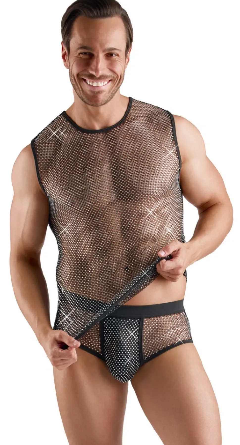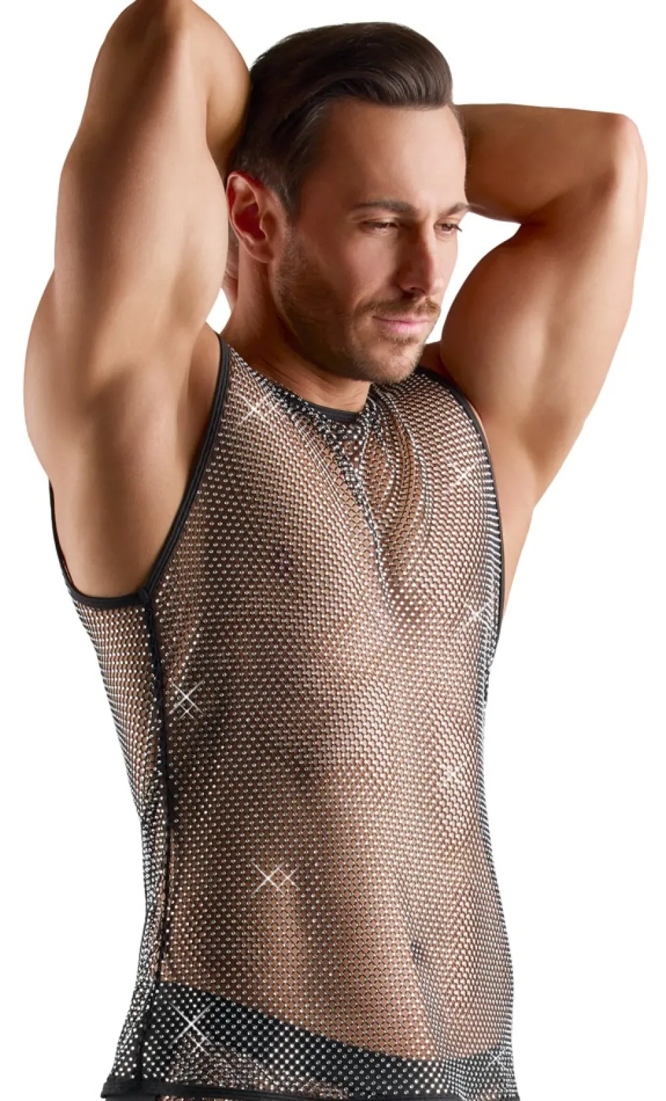 Betonendes, ärmelloses Netz-Shirt von Svenjoyment in aufregender schwarzer Transparenz. Über und über mit funkelnden Glitzersteinchen besetzt. Rundum luftig und weich anschmiegsam für maximalen Tragekomfort.