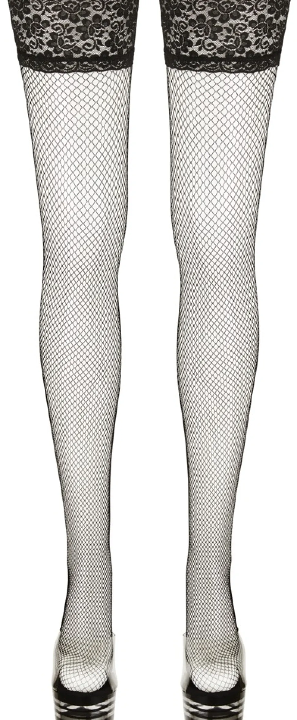 Halterlose Strümpfe aus feinmaschigem Netzmaterial und mit 10 cm breitem Spitzenabschluss. Die innen liegenden Silikonbänder sorgen für einen rutschfesten Sitz. Ein absolutes Must-have für schöne Beine, dass sich vielfältig kombinieren lässt.