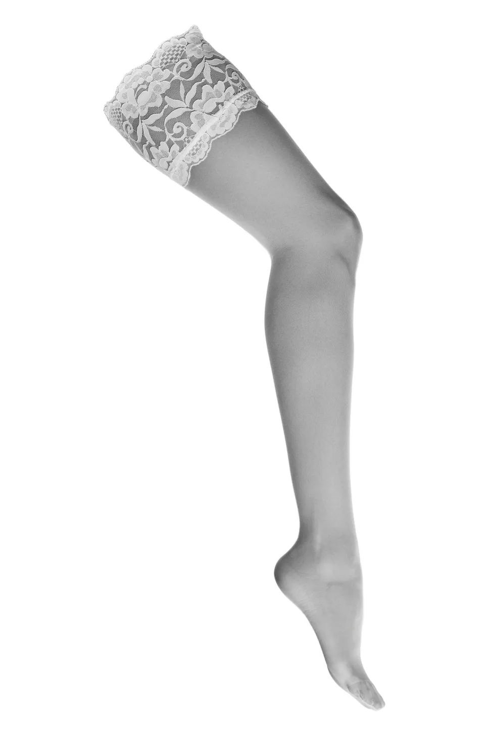 Bezaubernde halterlose Strümpfe versehen mit einem floralen Spitzenrand. Das weiche Material liegt angenehmen auf der Haut.
