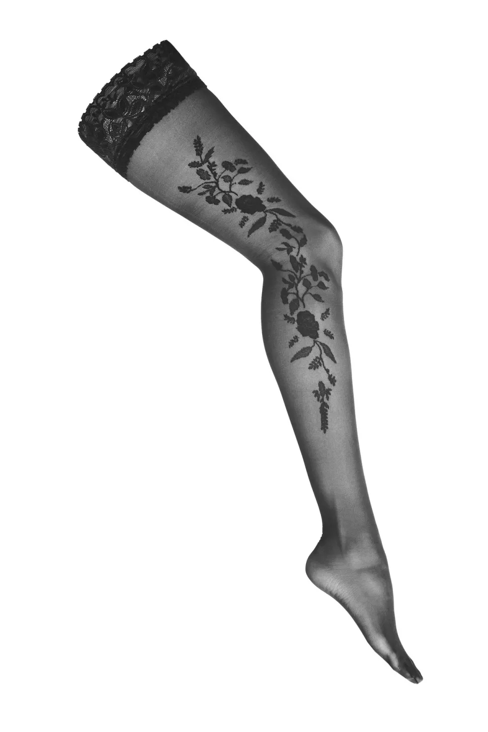 Verführerische halterlose Strümpfe mit einem Spitzenrand. An der Seite mit einem eingearbeiteten Blumenmotiv in der fast gesamten Länge versehen. Mit Silikon für guten Halt.