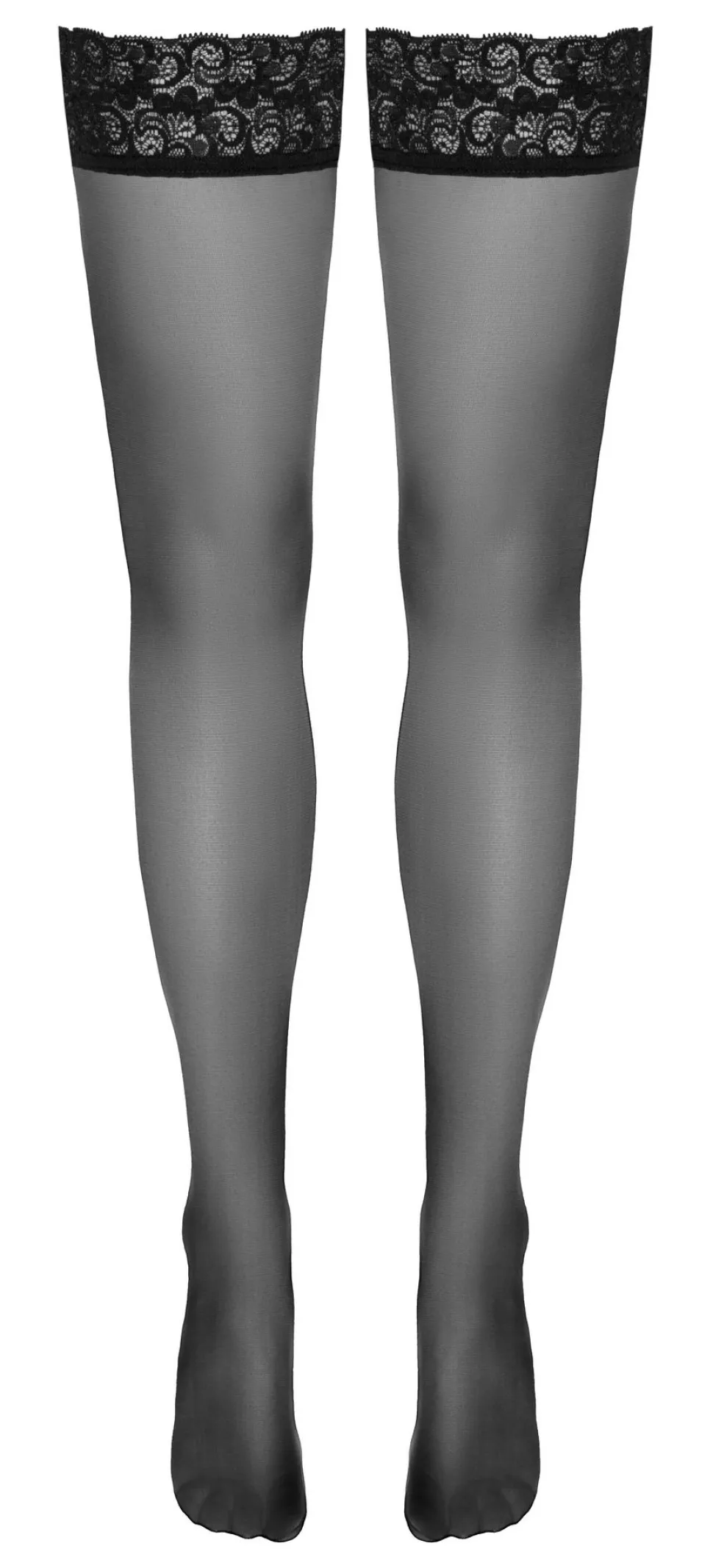 Halterlose schwarze Strümpfe von Cottelli LEGWARE mit schönem 6 cm breitem Spitzenabschluss. Innen mit Silikonverstärkung für rutschfesten Sitz und optimalen Halt.