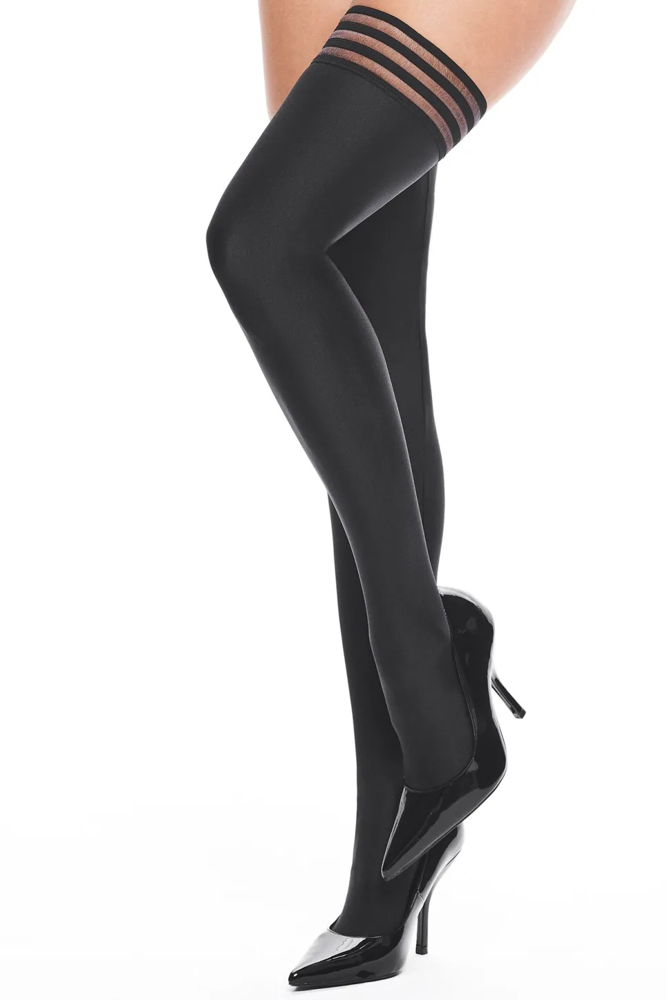 Bezaubernde halterlose Strümpfe im Wetlook Stil. Obenrum mit elastischen Bändern versehen. Das weiche Material liegt angenehmen auf der Haut. Mit Silikon für optimalen Halt.