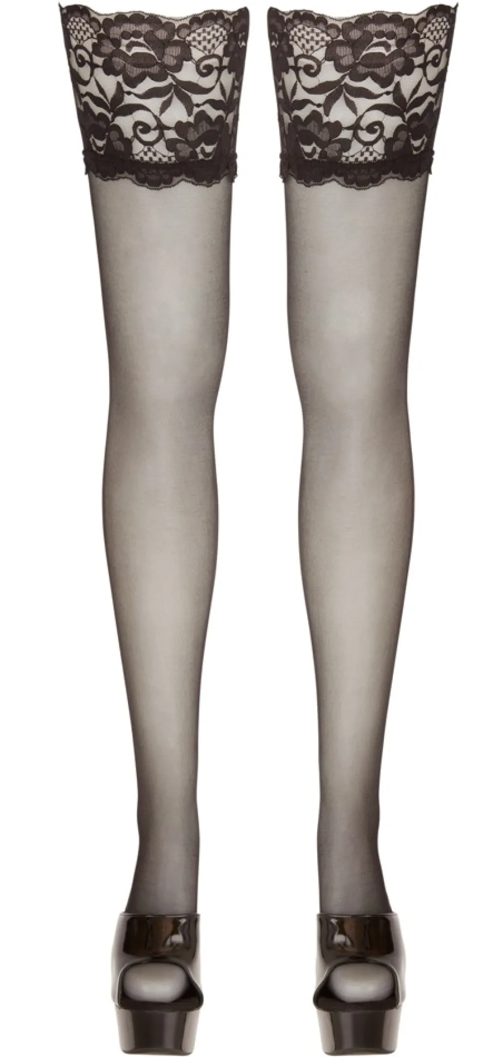 Halterlose Strümpfe mit einem 12 cm breiten Spitzenabschluss. Innen mit Silikonbändern für einen rutschfestem Sitz. 20 den.