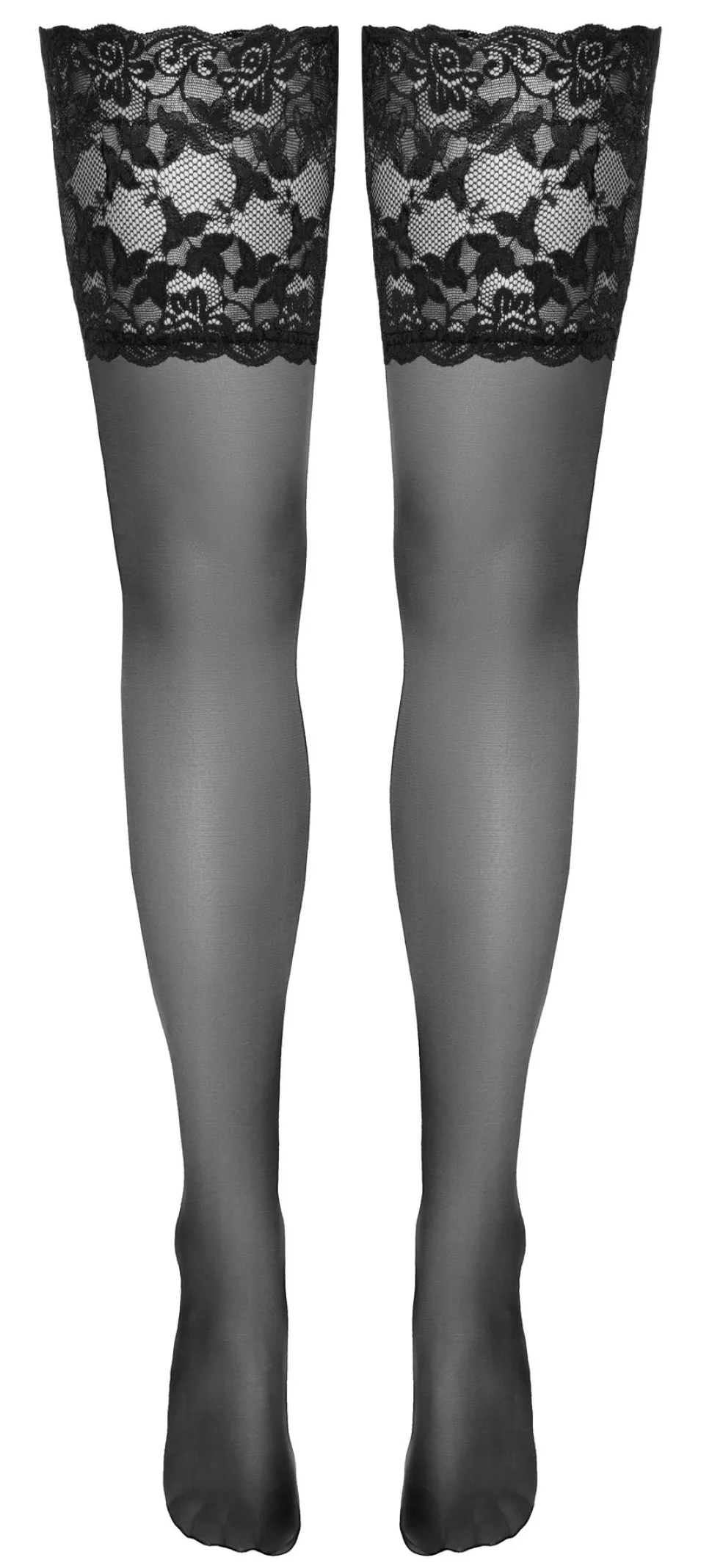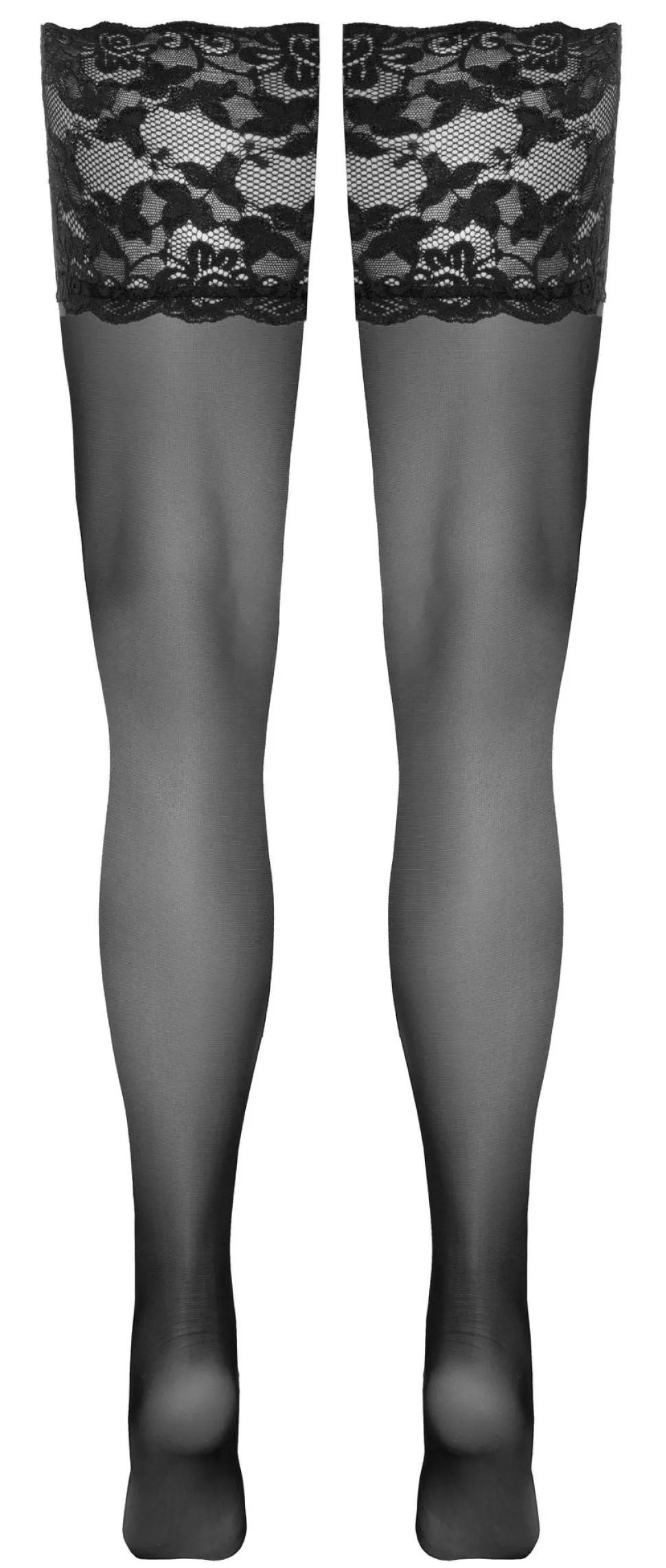 Für den edel-eleganten Look! Halterlose schwarze Strümpfe von Cottelli LEGWARE mit schönem, 14 cm breitem Spitzenabschluss. Innen mit Silikonverstärkung für rutschfesten Sitz und optimalen Halt.