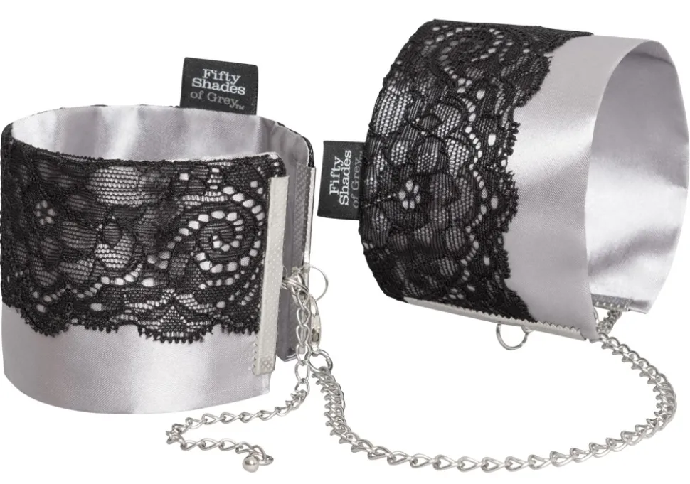 Elegante Handfessel Play Nice Satin & Lace Wrist Cuffs von Fifty Shades of Grey mit abnehmbarer Karabiner-Verbindungskette. Die komfortablen Manschetten aus silberfarbenem Satin sind mit schwarzer zarter Wimpernspitze verziert und im Umfang passend verstellbar.