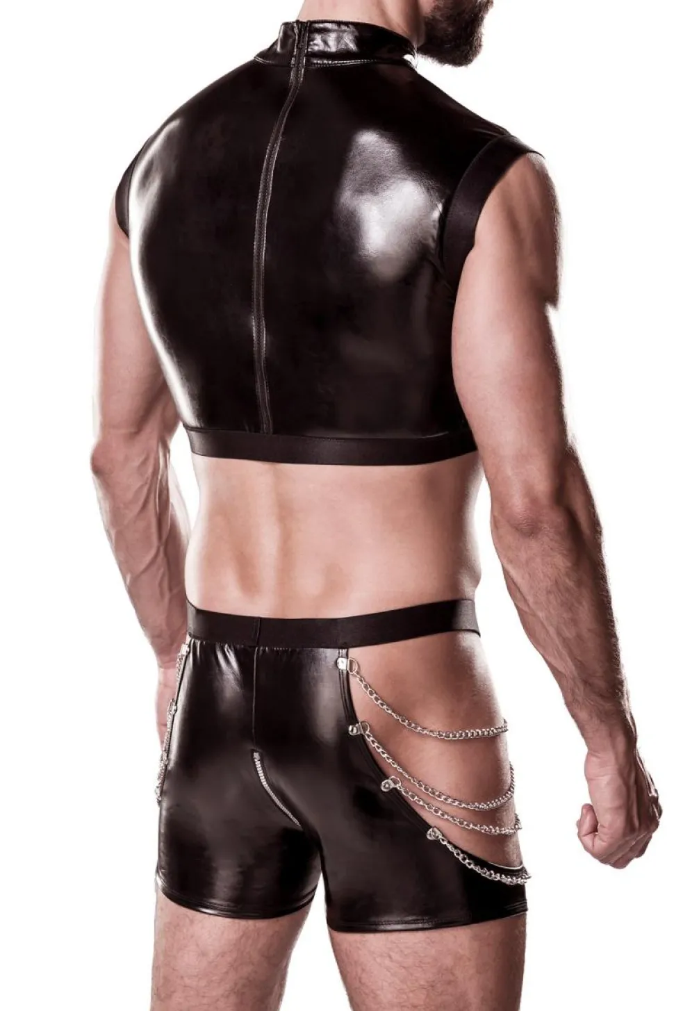 Diese aufregende Clubwear-Set besteht aus einem Oberteil mit Cut-outs und Chaps in Shortlänge. Die Short hat ebenso Cut-outs. Diese sind jeweils mit Ketten verziert. Mit diesem Stammgast-Outfit, zieht man die Blick nicht nur auf dem Dancefloor auf sich. Ganz klarer Fall, MUST HAVE!