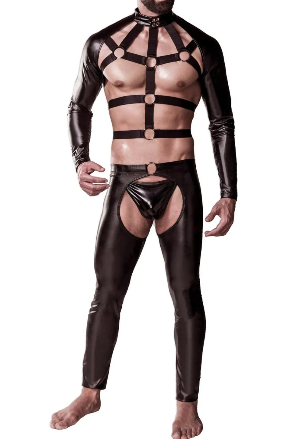 Dieses mehrteilige Clubwear-Set für den Herren, besticht durch sexy Design und raffinierten Details. Der Bolero ist aus hochwertigem Lederimitat. Das verbundene Harness-Oberteil, ist mit weichen Gummibändern verziert und lässt sich hinten verstellen. Die Chaps sind eng geschnitten und geben somit eine Körperbetonende Silhouette. Durch den Gummibund, halten sie auch gut. Der passende String ist mit dabei.