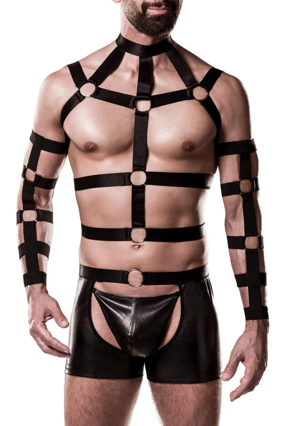 Dieses stylische Harness-Set für Herren, ist einfach nur sexy. Die weichen Gummibänder lassen sich hinten verstellen und sorgen so für guten Halt. Die Chaps in Shortlänge, sind schon der Knaller und einen Blick wert. Der passende String ist dabei. Chaps und String sind aus Lederimitat gefertigt. MUST HAVE for the next Party!