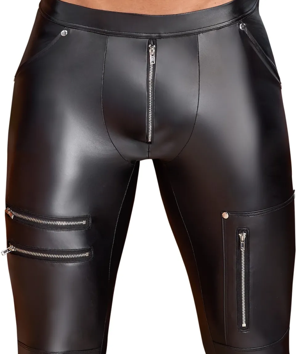 Schmale Hose von NEK im schwarzen Mattlook mit silberfarbenen Zip- und Nieten-Details. Mit bezogenem Stretchbund und rundum weich & elastisch für hohen Tragekomfort. Vorne unterlegter Reißverschluss und 2 Eingriffstaschen. Aufgesetzte Schenkeltasche mit Reißverschluss sowie dekorative Reißverschlüsse zum Öffnen am Oberschenkel und unten an den Beinen. Falten im Kniebereich für viel Bewegungsfreiheit. Hinten 2 aufgesetzte Gesäßtaschen.