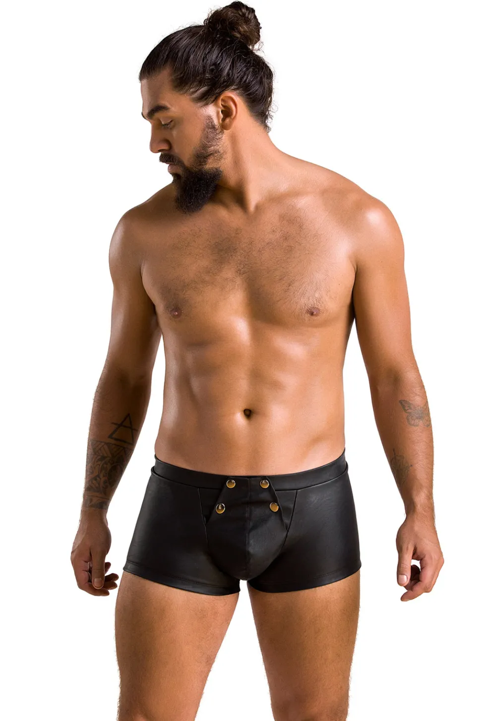 Schwarze betonende Short von Passion im trendigen Mattlook – schmiegt sich hautgenau an. Im vorderen Bereich mit Nieten zum Öffnen, sodass dieser Bereich komplett runtergeklappt werden kann. Rundum weich für höchsten Tragekomfort.