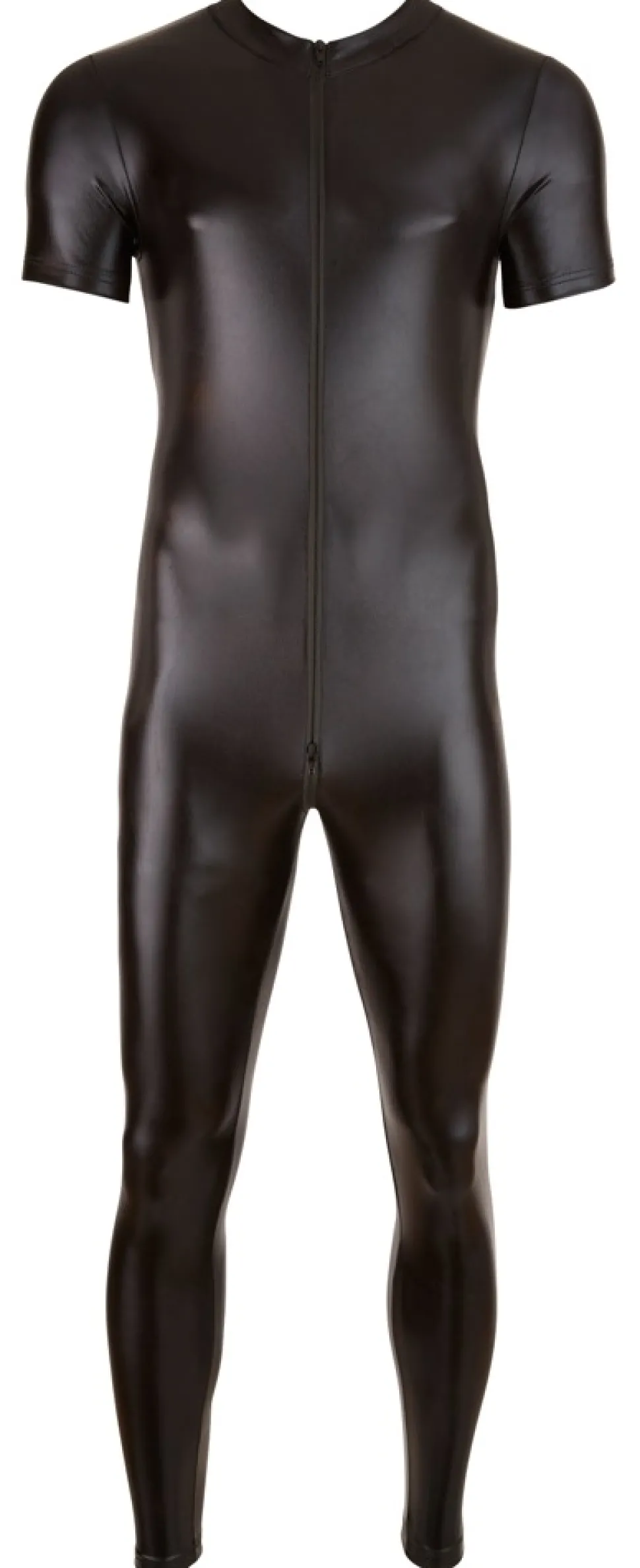 Hochelastischer Wetlook-Overall mit langem, schmalen Bein und kurzem Arm. In der Front mit 3-Wege-Reißverschluss bis über den Po.
