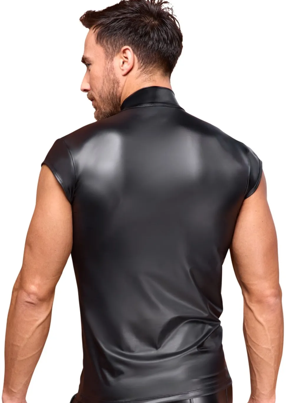 Schwarzes betonendes Shirt von NEK im schimmernden Mattlook. Mit überschnittenem kleinem Arm und aufregendem V-Cut-out vorne unter dem dominanten Stehkragen mit Frontring. Rundum weich und elastisch anschmiegsam für hohen Tragekomfort.