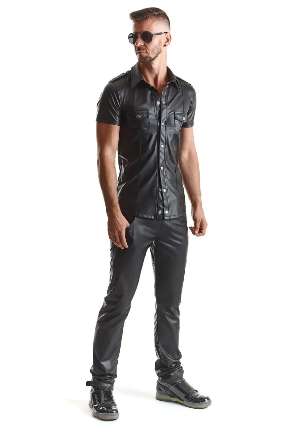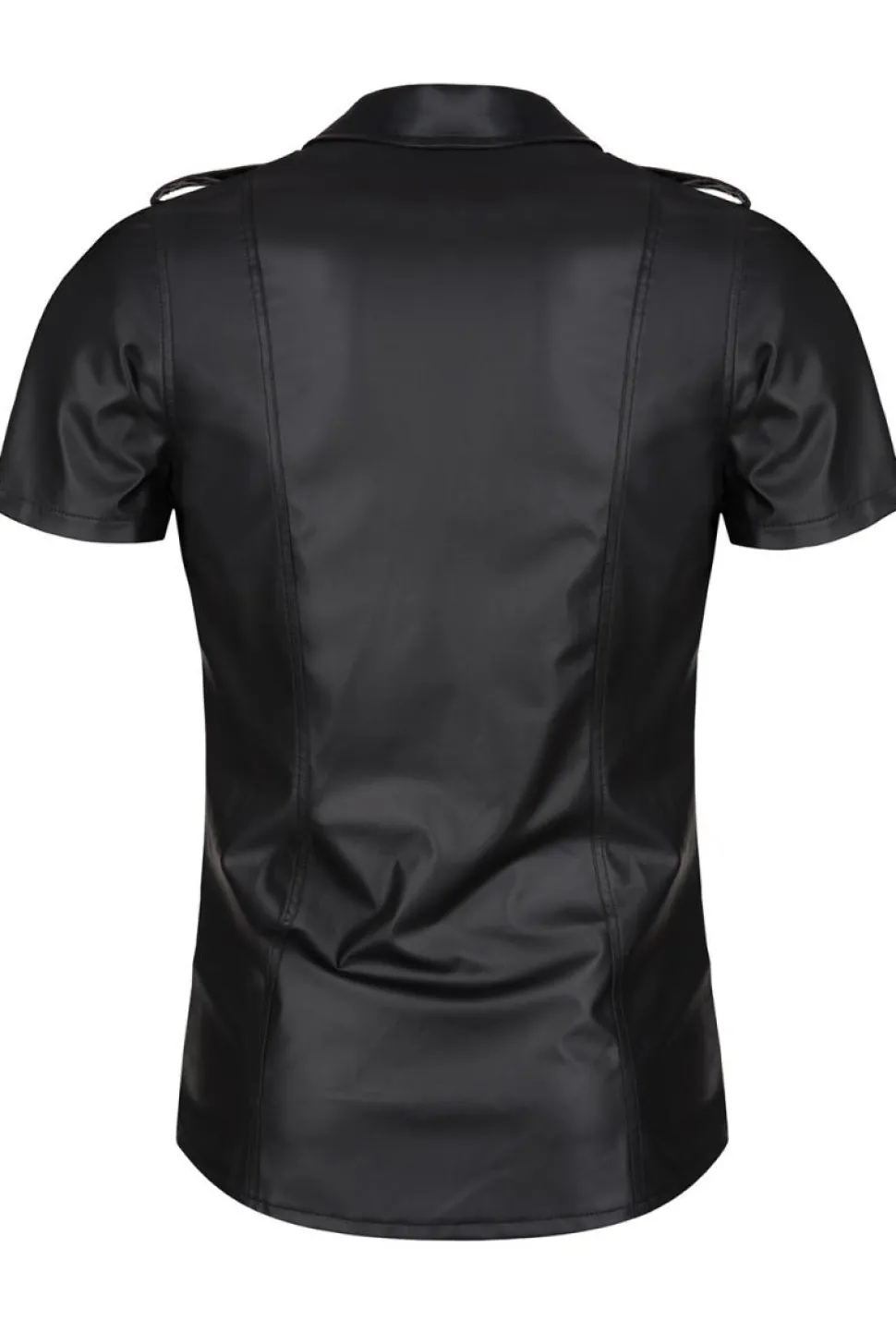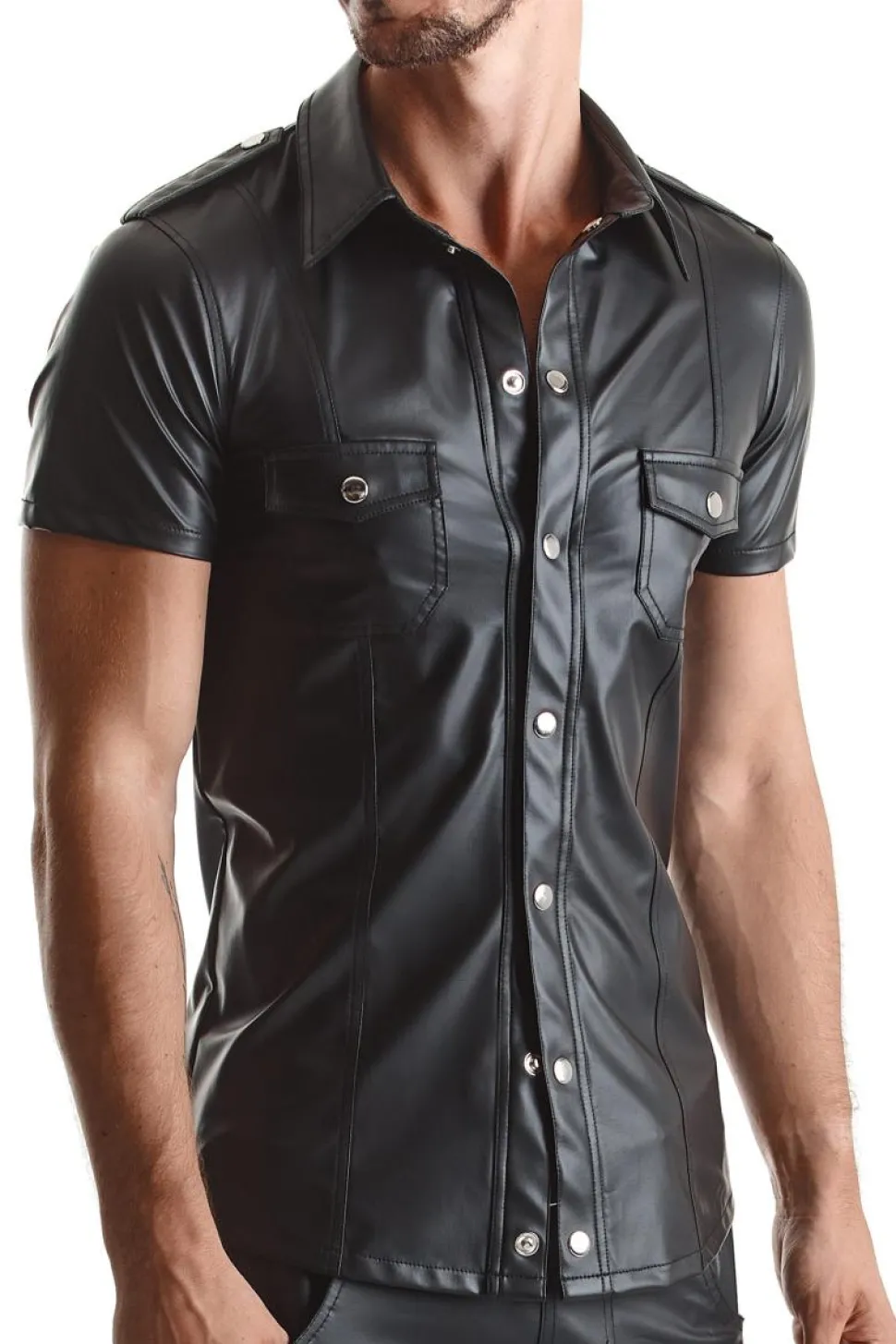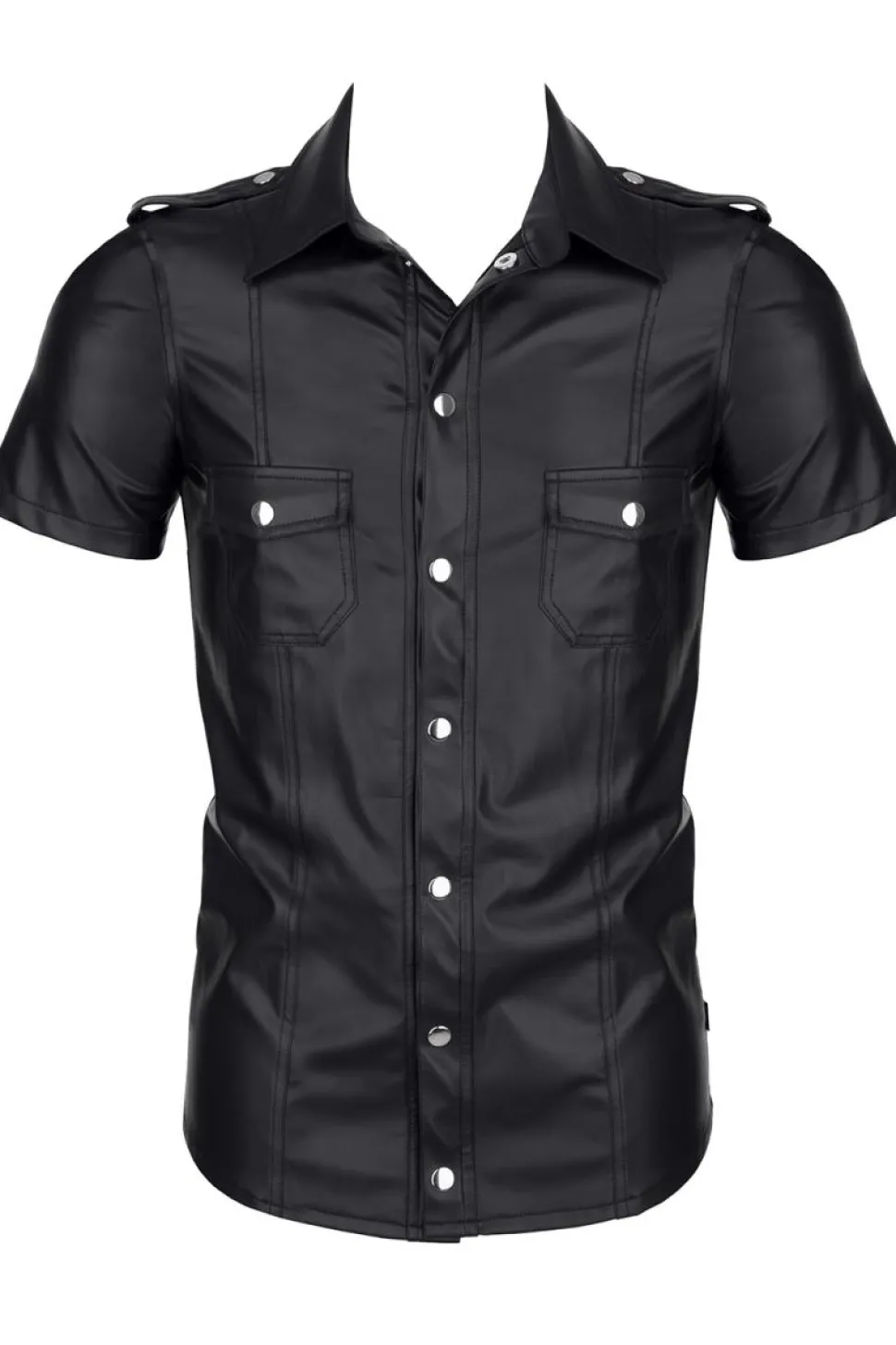 Herren Hemd, gefertigt aus mattem, dehnbarem Wetlook Material, mit Stehkragen und Druckknöpfen aus Metall.