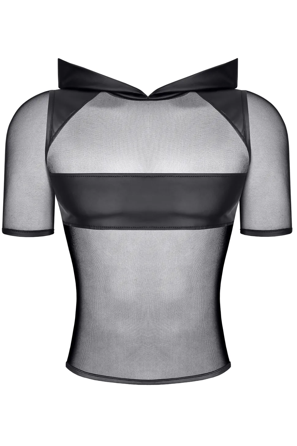 Dieses T-Shirt ist aus weichem, dehnbarem, schwarzem Mesh gefertigt. Einsätze in Wet-Look-Optik an Schultern und Brust sorgen für einen markanten Kontrast und verleihen dem Oberteil einen einzigartigen Charakter. Das transparente Material setzt Ihre Figur, Tattoos oder Piercings gekonnt in Szene. Die weite Kapuze in Wet-Look-Optik verleiht dem Shirt einen zusätzlichen Hingucker.