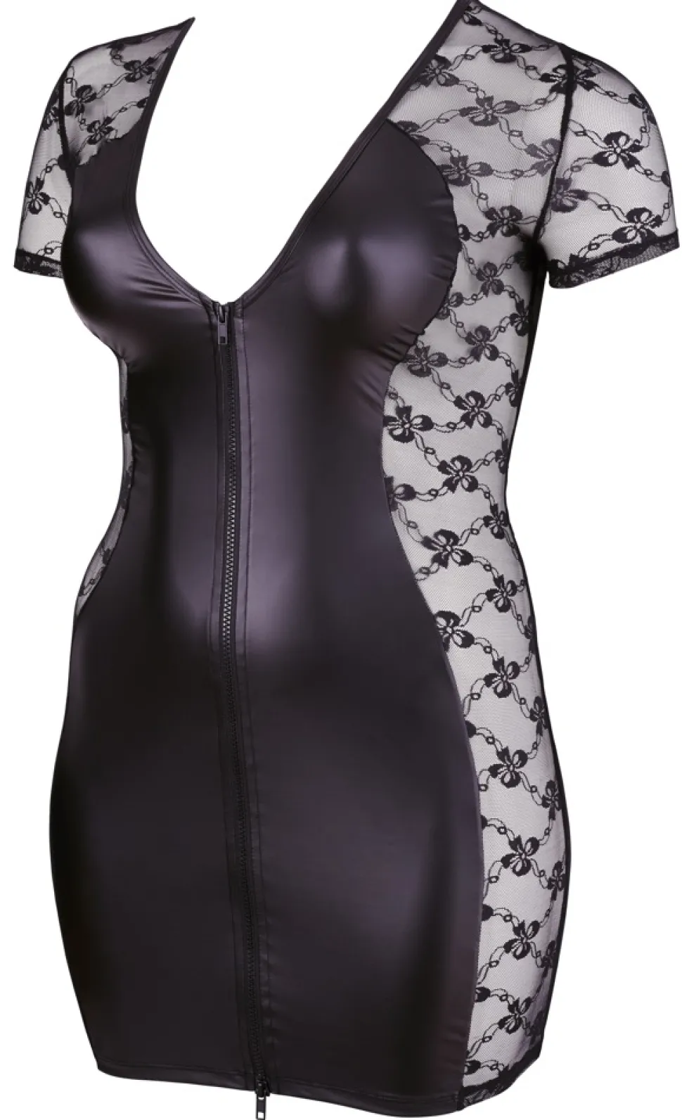 Das taillierte Kleid mit kurzem Arm lockt vorne wie hinten mit tiefem Ausschnitt sowie mit durchgehendem 2-Wege-Reißverschluss in der Front. Vorne und hinten aus leicht transparentem Stoff, seitlich aus zarter Spitze.