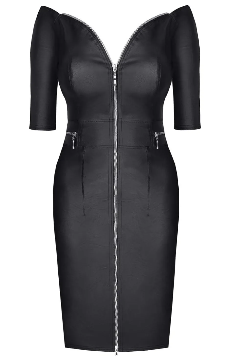 Dieses Kleid aus dehnbarem Kunstleder ist elegant und sexy zugleich. Der vordere Reißverschluss ist ein Zwei-Wege-Zipper und die kleinen Reißverschlüsse an den Seiten und auf den Oberseiten der Ärmel, geben diesem Bleistiftkleid ein unwiderstehlichem Look. Das Material ist super weich und schmiegt sich deiner Haut sanft an.
