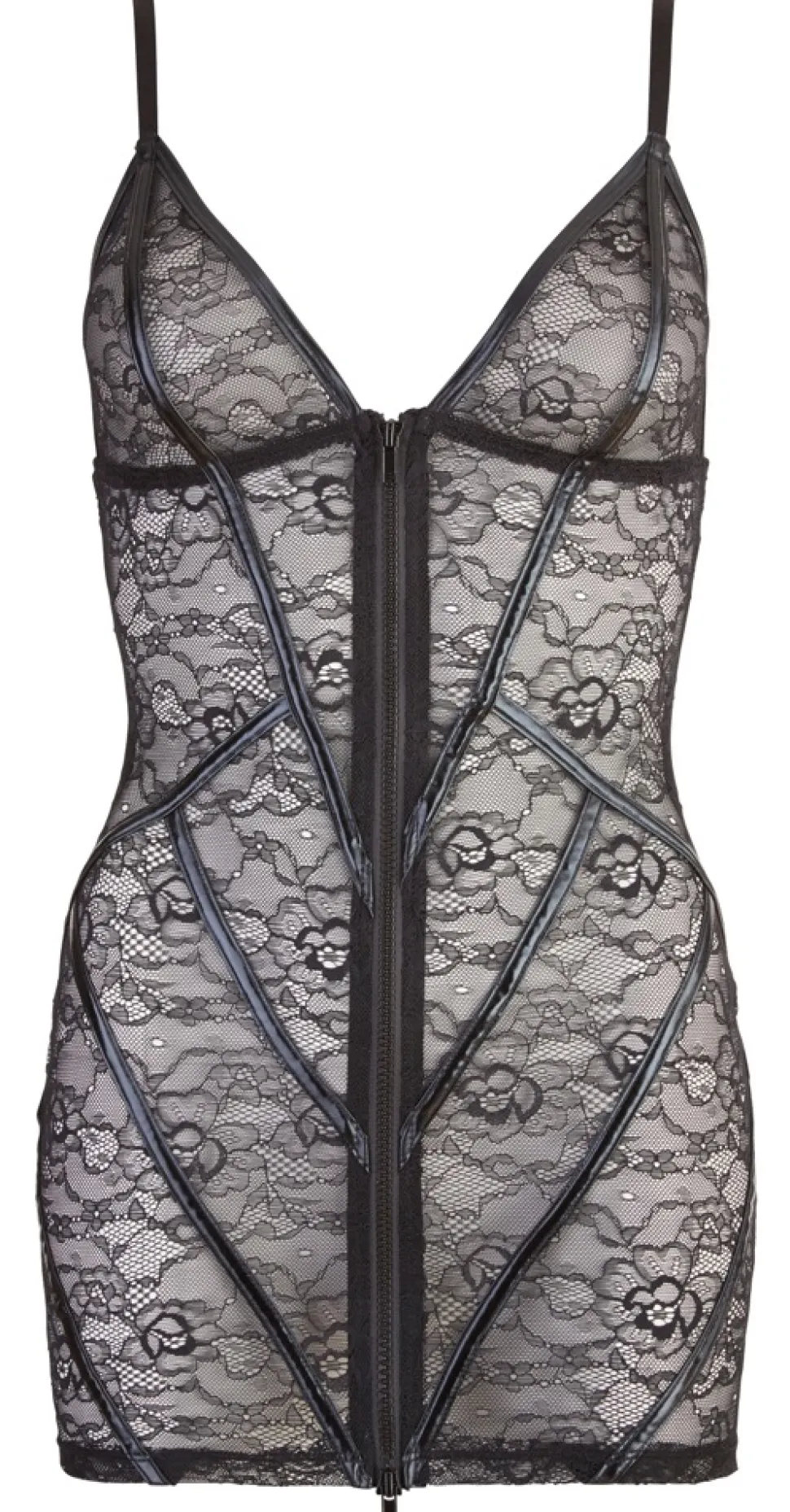 Dieses schwarze Kleid aus feiner Blumenspitze mit rockigen Wetlook-Streifen in der Front ist gar nicht so unschuldig, wie es auf den ersten Blick wirkt, denn mit nur einem Zug vorn am durchgehenden Zwei-Wege-Reißverschluss enthüllt es alles, was darunter liegt… Träger verstellbar. 90% Polyamid, 10% Elasthan.