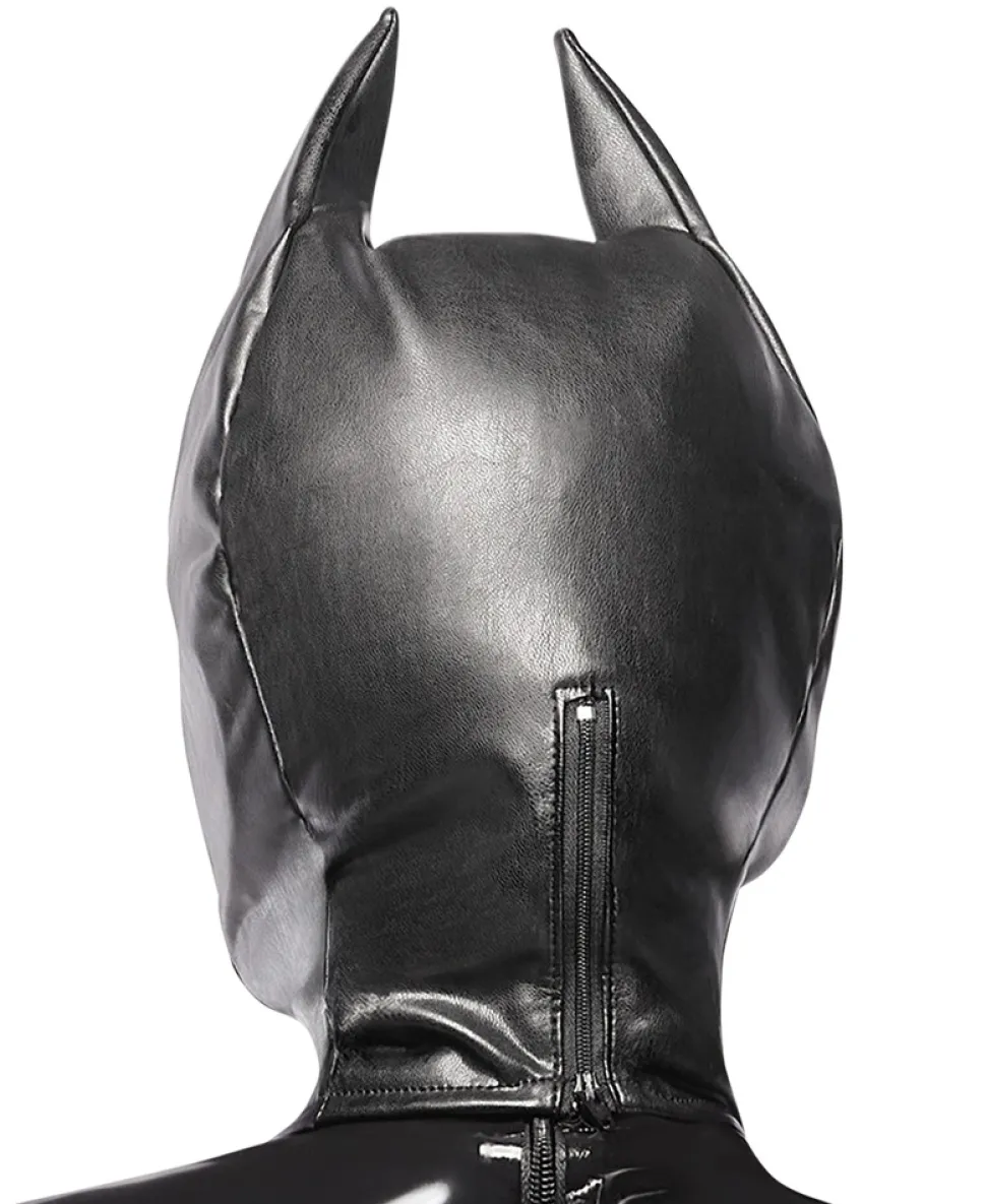 Schwarze enganliegende Kopfmaske von Bad Kitty aus stilvollem Lederimitat. Mit spitzen Ohren, Mund- und Augen-Öffnungen.