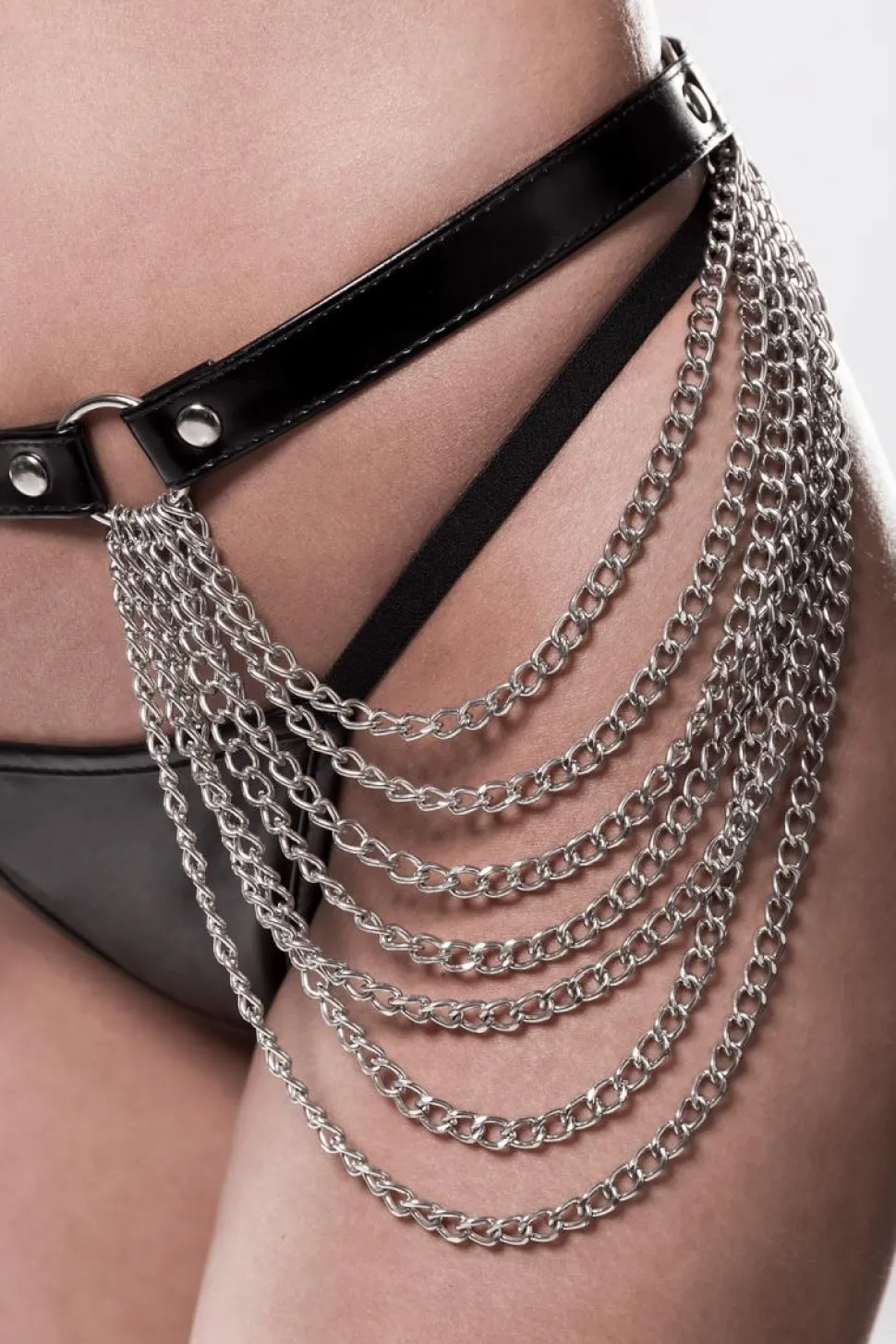 - Lieferumfang: Harness-Top mit Ketten, selbstklebende Nippel-Patches, Hüftband mit Zierketten, passendem String