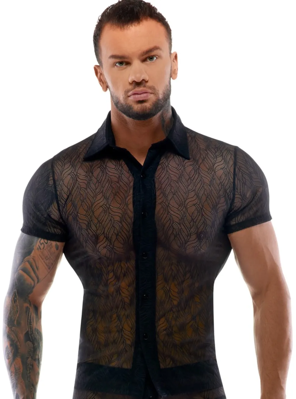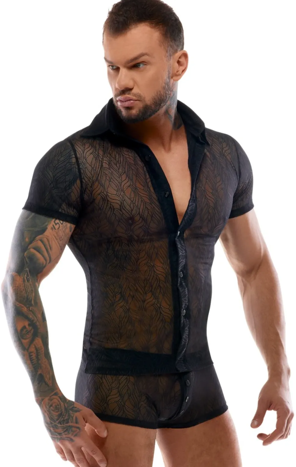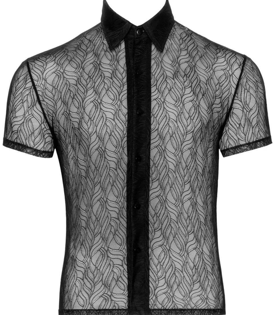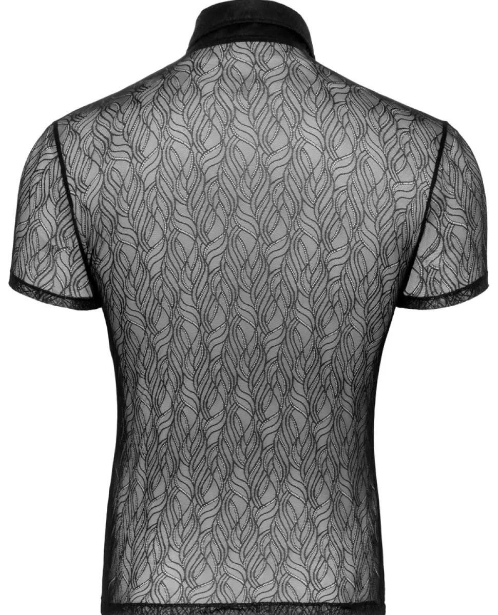 Enges, betonendes Halbarm-Hemd von Svenjoyment aus feiner, weicher Stretch-Spitze. Mit Kragen und durchgehender Knopfleiste vorne.