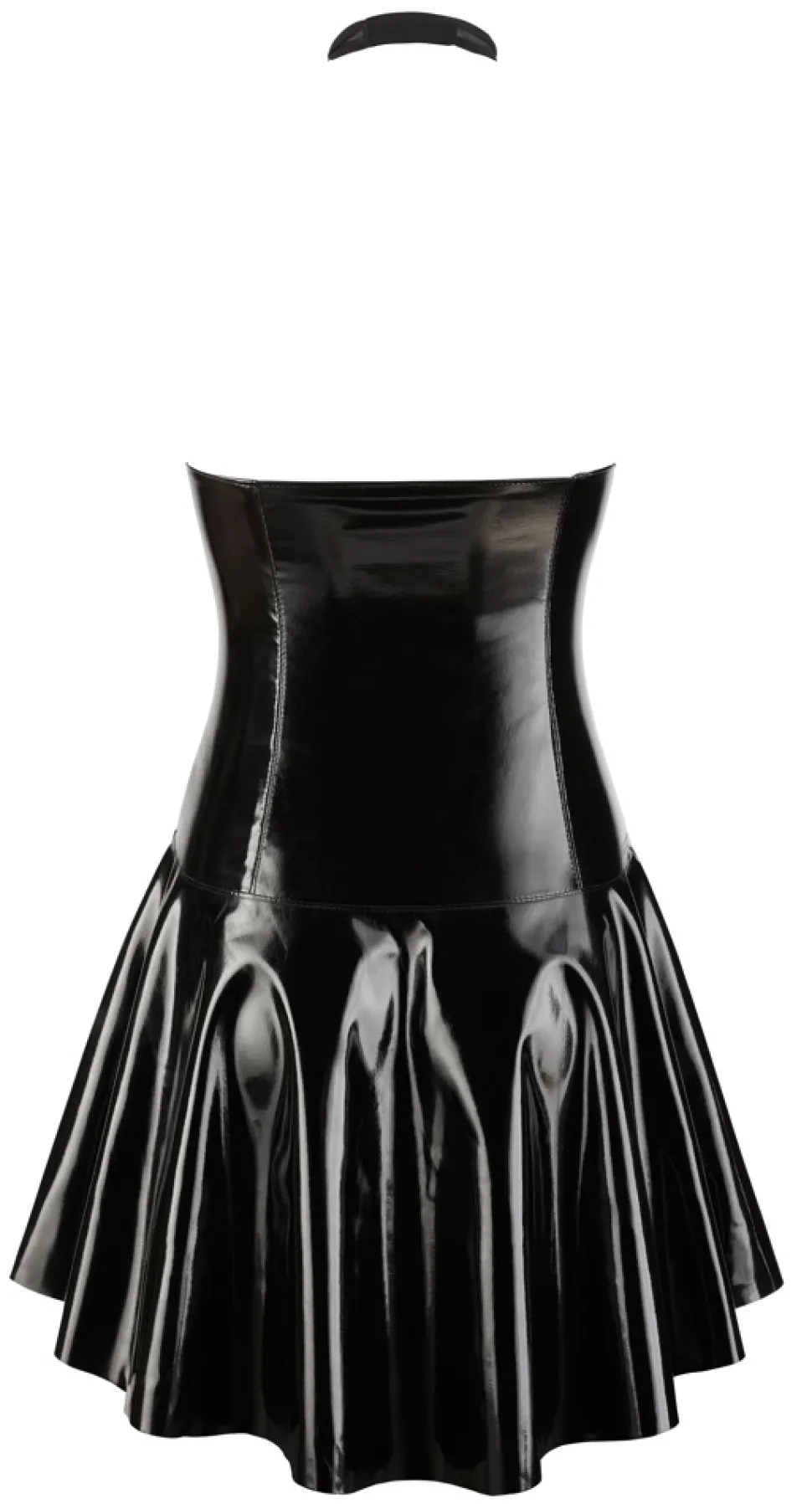 Dieses kurze Kleid von Black Level komplett im schwarzen Lackglanz mit Cups und Neckholder aus zartem Netz. In figurnaher Schnittführung mit ausgestelltem Röckchen, das hinten ein bisschen länger gearbeitet ist als vorne. Vom tiefen Dekolleté bis zum Saum führt vorne ein durchgehender Reißverschluss.