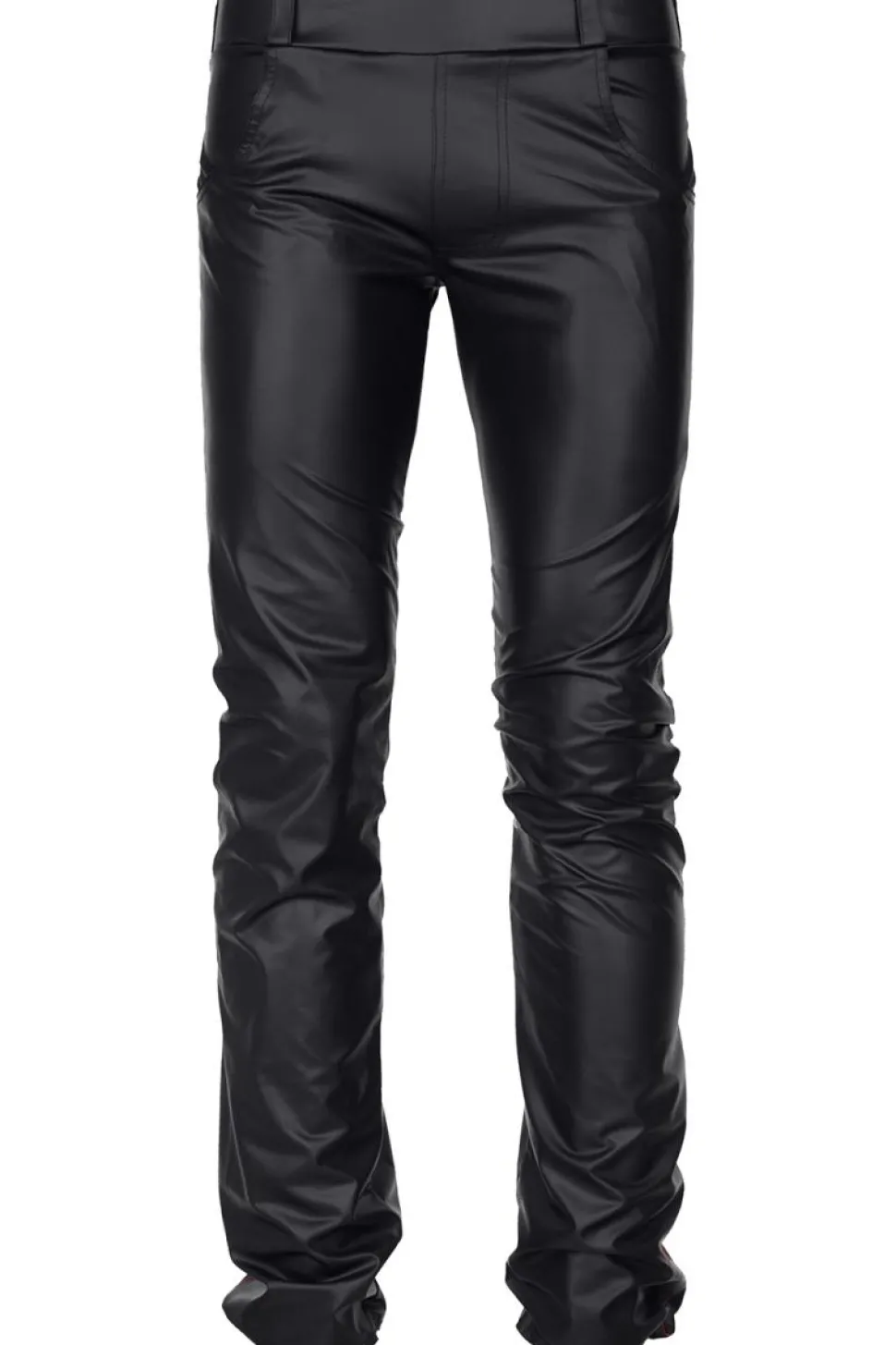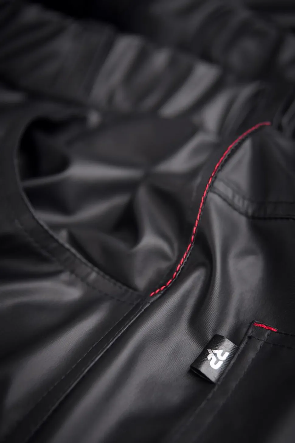 Hose mit tiefer Taille, gefertigt aus elastischem, schwarzem Wetlook-Material. Die tiefe Taille und schmalere Hüftlinie betonen die Form des Gesäßes. Die ebenfalls abgesenkten Gesäßtaschen betonen ihre Form noch mehr. Taschen auf Vorder- und Rückseite sind eine praktische Lösung. Sie können darin Schlüssel, Geldbörse, Telefon usw. verstecken. Die Hose haben Gürtelschlaufen. Roter Alcantara-Patch mit lasergebranntem RFP-Logo und roter Naht unterstreichen die Einzigartigkeit des Produkts.