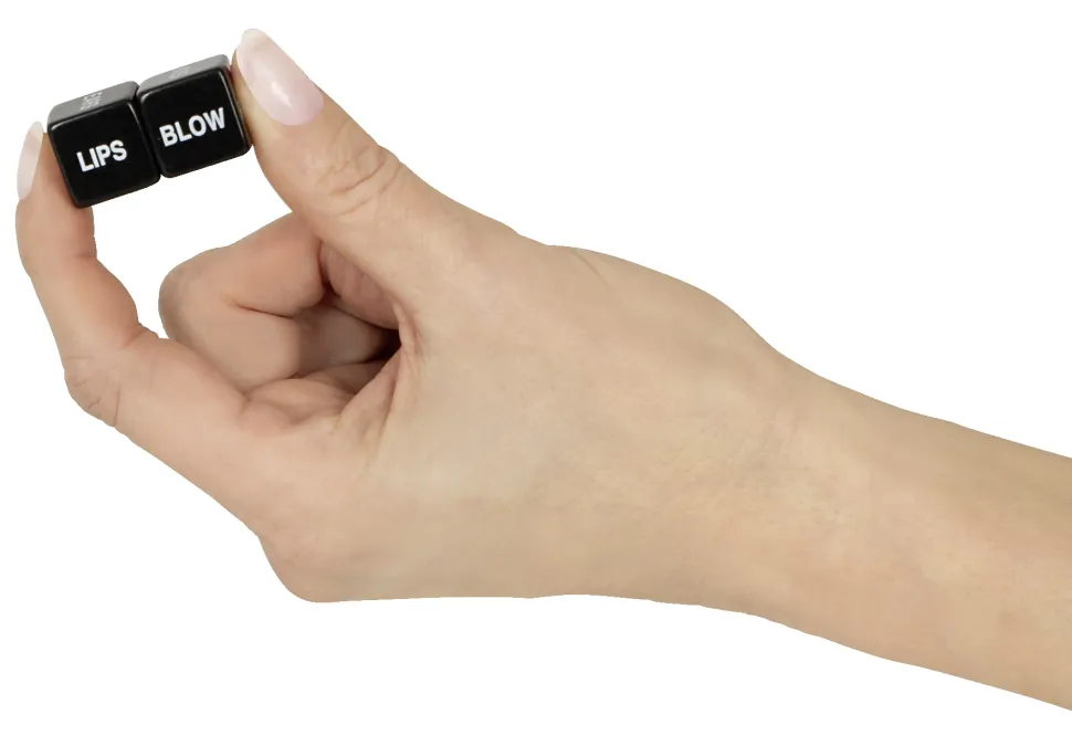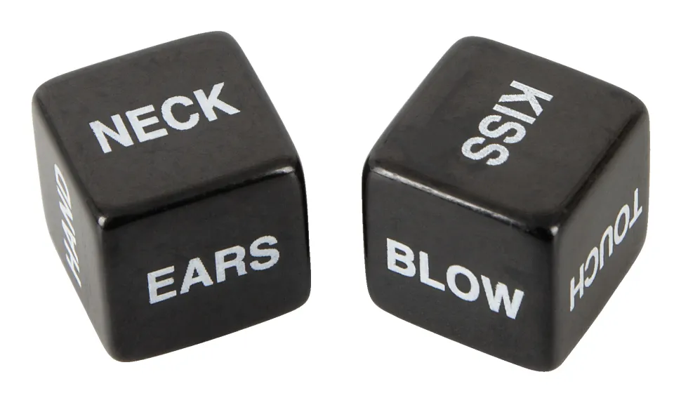 2 Liebeswürfel im Set in edler schwarzer Optik mit weiß aufgedruckten Begriffen auf Englisch. Ein Würfel benennt die auszuführende Aktion, der andere Würfel die Körperpartie – ein Wurf (und der Zufall) entscheidet, wie und wo am Körper des/der Partner:in stimuliert wird.