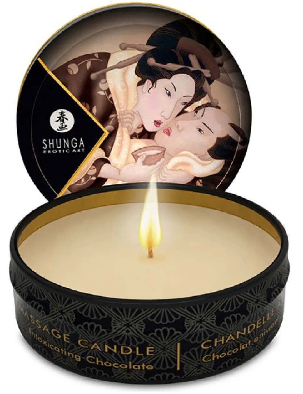 Schokolade wird eine aphrodisierende Wirkung nachgesagt – und sie soll uns glücklich machen. Sicher ist: Mit dieser Massagekerze können Sie nicht nur innerhalb kürzester Zeit magische Momente mit intensivem Schokoladenduft erleben, sondern sich auch mit himmlischen Massagen verwöhnen lassen. Einmal entzündet verströmt aus ihr ein köstlicher Schokoladenduft und das Wachs verwandelt sich in zartpflegendes Massageöl. Ein Hochgenuss, völlig ohne Kalorien. Die kleine Schmuckdose aus Metall mit japanischem Erotik-Motiv passt nicht nur in jede Reisetasche, sie ist auch eine originelle Geschenk-Idee für Freunde, denen Sie etwas Gutes tun möchten.