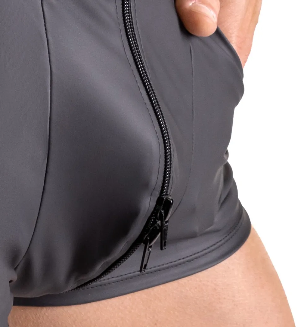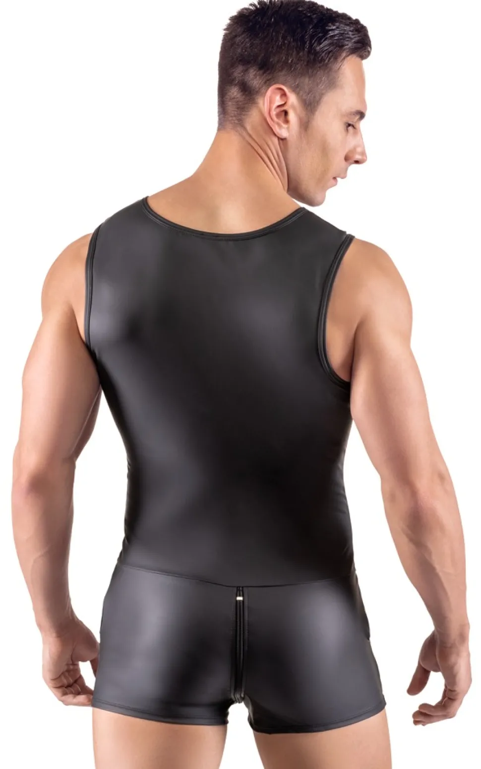 Ärmelloser Overall von Svenjoyment mit kurzem Bein und großen Eingrifftaschen. Rundum im trendigen schwarzen Mattlook und körperbetont geschnitten. Mit 3-Wege-Reißverschluss halsabwärts durch den Schritt bis über den Po. Die elastische Qualität schmiegt sich passformsicher hautnah an und trägt sich höchst bequem und komfortabel.